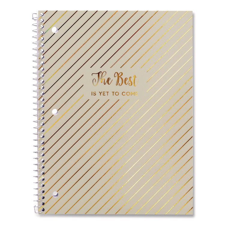 Introducing our one-subject notebooks, perfect for all of your note-taking needs. Gorgeous motivational quotes on the front cover and hot foil detailing, adding a touch of style and daily encouragement to your stationery collection. Ideal for capturing detailed notes, lists and ideas. These notebooks provide a smooth writing surface, ideal for everyday use. The college-ruled format ensures your notes stay neat and structured, whether you're in class, at work or at home. The notebooks are also designed with a three-hole punch feature, allowing for easy integration into standard binders. This practical addition ensures that your notes stay organized and accessible, making it simple to store and reference them within any binder or filing system. Pocket-Sized Indicator: No; Book-Binding Type: Wire-O; Book-Binding Details: Wire-O: Flexible Cover; Book-Binding Edge: Side.