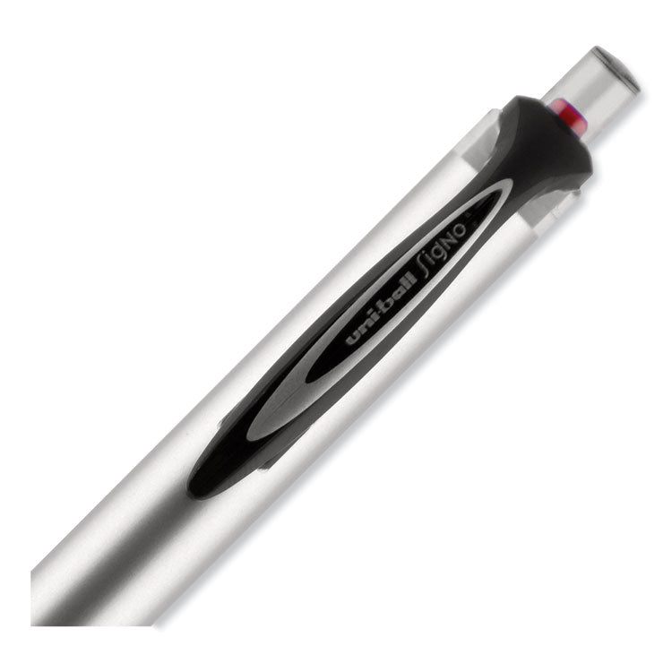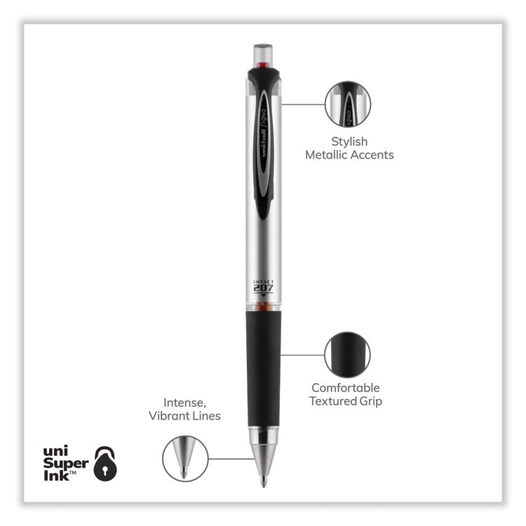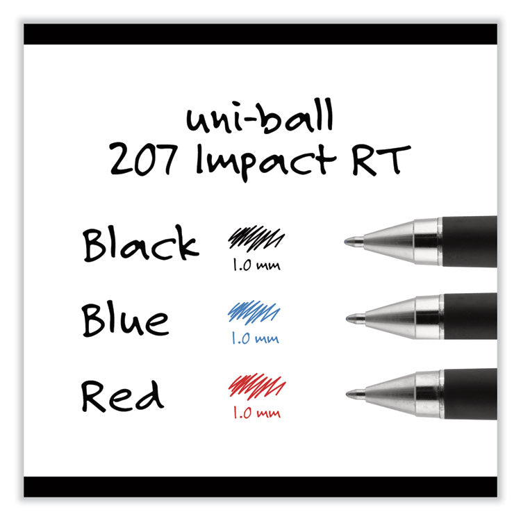 Make an impact with 207 IMPACT RT Gel Pens from uni-ball featuring a 1.0 mm bold point with a stainless steel tip that resists bending and breaking. Even-flowing, pigment-based gel ink renders an outstanding ink laydown for a smooth writing experience and strikingly bold lines. Use these retractable gel pens for everyday writing tasks, check signing and all of your important signatures, trusting its quick-drying uni Super Ink. Exclusive uni Super Ink technology entrenches the gel ink deep into the paper, preventing document alteration, water damage or fading. The 1.0 mm point delivers bold writing with a silky finish. A soft rubber grip helps you continue writing without fatigue while maintaining precision and detail throughout your tasks, and when your writing is complete, the innovative clip auto retracts the tip, protecting against unwanted gel ink marks and stains. Lend a vivid touch to your writing with these sophisticated retractable gel pens that glide smoothly for distinct and neat writing. Pen Sub-Brand & Product Family: 207™ Impact™; Pen Type: Gel Pen; Pen Style: Retractable; Pen Tip Type: Conical.