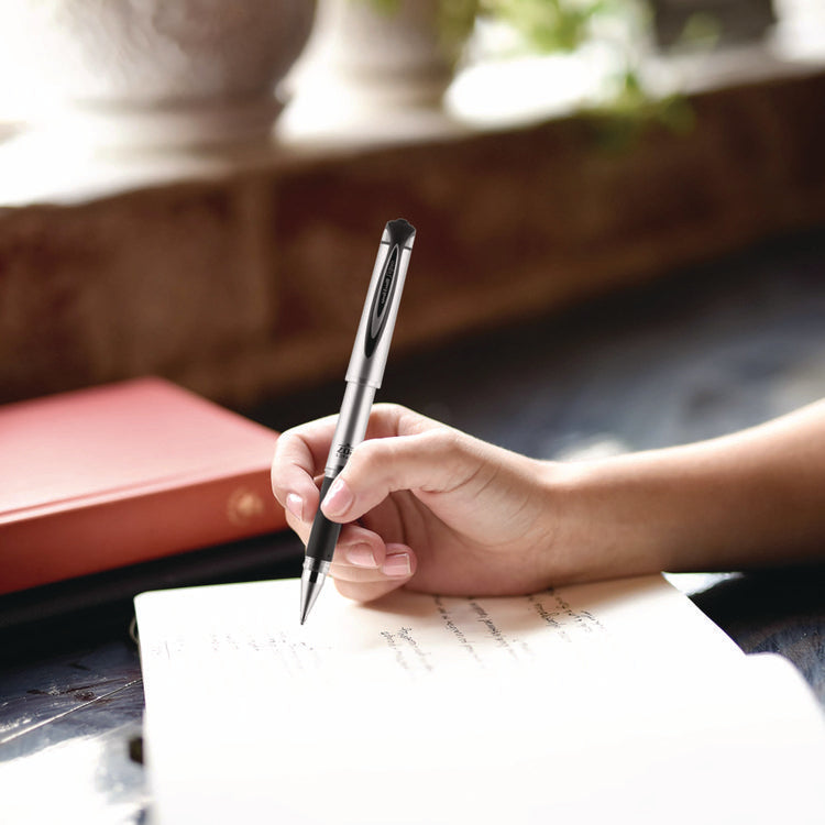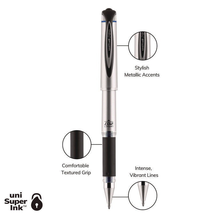 Make an impact with 207 IMPACT Gel Stick Pens from uni-ball featuring a 1.0 mm bold point with a stainless steel tip that resists bending and breaking. Even-flowing, pigment-based gel ink renders an outstanding ink laydown for a smooth writing experience and strikingly bold lines. Use these capped stick gel pens for everyday writing tasks, check signing and all of your important signatures, trusting its quick-drying uni Super Ink. Exclusive uni Super Ink technology entrenches the gel ink deep into the paper, preventing document alteration, water damage or fading. The 1.0 mm point delivers bold writing with a silky finish. A soft rubber grip helps you continue writing without fatigue while maintaining precision and detail throughout your tasks. Lend a vivid touch to your writing with these sophisticated gel stick pens that glide smoothly for distinct and neat writing. Pen Sub-Brand & Product Family: 207 Impact; Pen Type: Gel Pen; Pen Style: Stick; Pen Tip Type: Conical.
