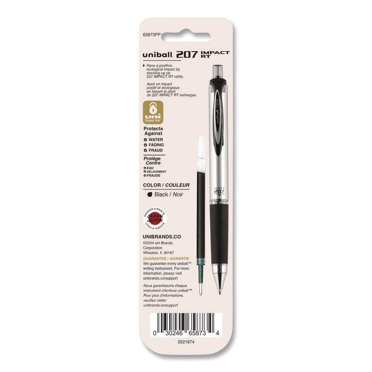 Make an impact and maintain it with 207 Impact RT Gel Retractable Pen Refills. They're designed specifically for the sophisticated and stylish 207 Impact RT Gel Retractable Pen. Each refill features even-flowing, pigment-based gel ink to deliver the same outstanding ink laydown and luxurious writing experience that you've come to expect. Whether you're signing important documentation, developing records for an archive or simply performing everyday writing tasks, you can also trust its quick-drying uni Super Ink technology to entrench your marks deep into the paper to prevent document alteration, water damage and fading. Its ultra-durable stainless-steel tip provides excellent bend and break resistance, while its smooth-glide point helps you produce the pronounced lines and lettering that make 207 Impact Gel Pens a professional's first choice. Refill Format: Standard Gel; Refill For Series: uniball® 207 Impact RT Gel Retractable Pens; Refill Ink Color: Black; Color Family: Black.