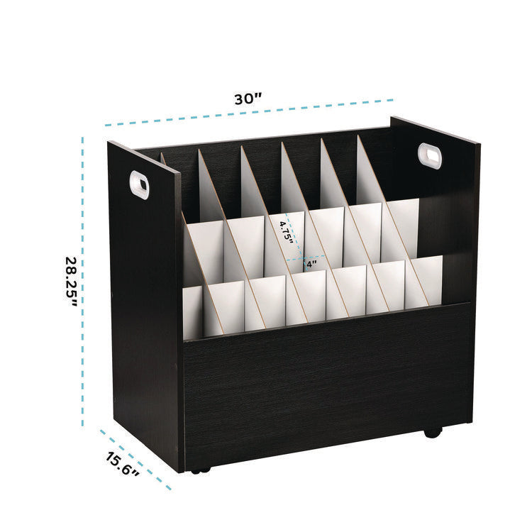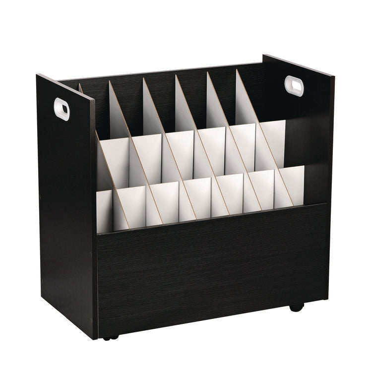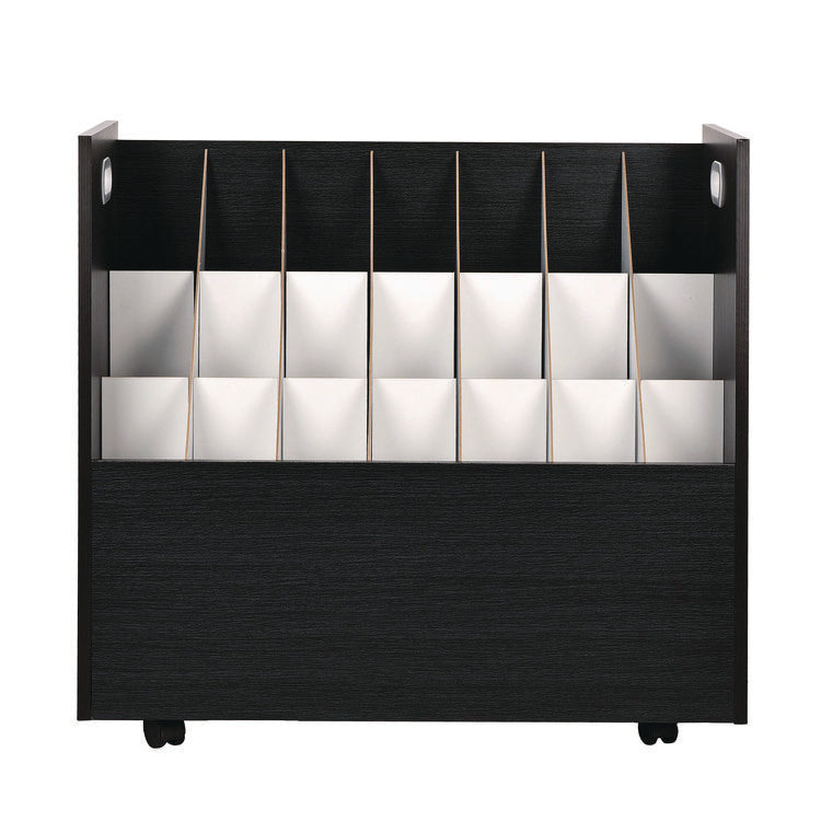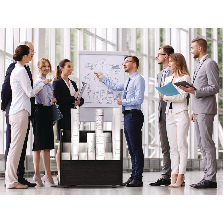 No matter how elaborate your current work-in-progress is, there's an efficient storage solution for keeping it organized. The AdirOffice Mobile Wood Blueprint Roll File holds your rolled blueprints, plan drawings, maps and other large-format documents snugly in square compartments, making it the perfect organizational solution. Sturdy and visually appealing, the unit is expertly crafted using durable wood composite to provide long-lasting strength and use for many years to come. It's furnished in laminate that will seamlessly complement any existing decor and boasts a 50 lb weight capacity to hold all of your rolled files in one convenient place. The bottom of the cabinet is outfitted with four swiveling casters to facilitate easy movement of your documents, while side handles make it easy to hold and transport the unit from one location to the next. Color(s): Black; Number of Compartments: 21; Overall Width: 30"; Overall Depth: 15.75".