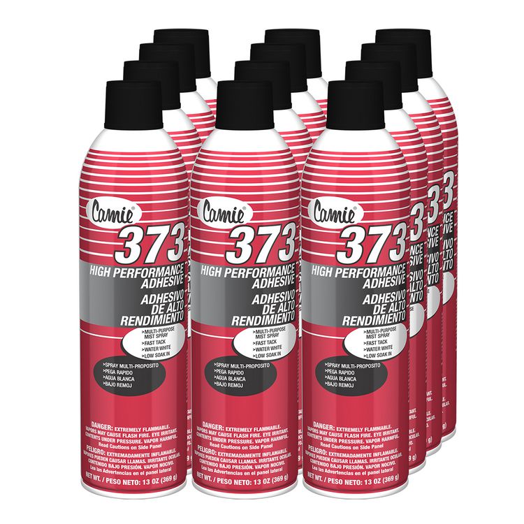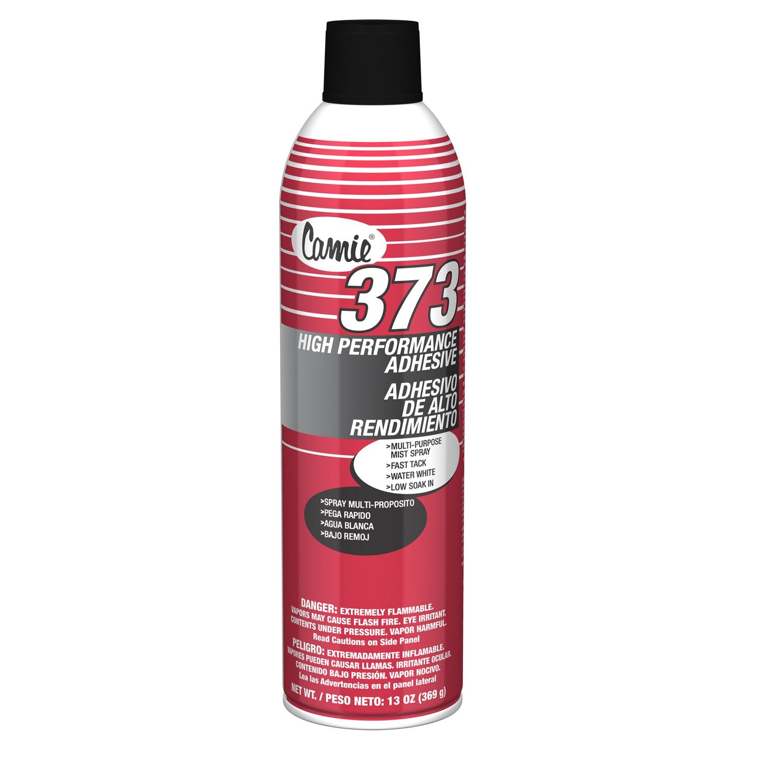 Camie 373 is excellent for a variety of jobs for industry, display and fixtures. It can be used to bond lightweight materials to a variety of substrates or itself. Camie 373 can offer temporary or permanent bonds. It is non-staining and water white in color. Adhesive Type: Aerosol/Spray; Product Packaging: Can; Washable/Removable: No; Color on Application: White.