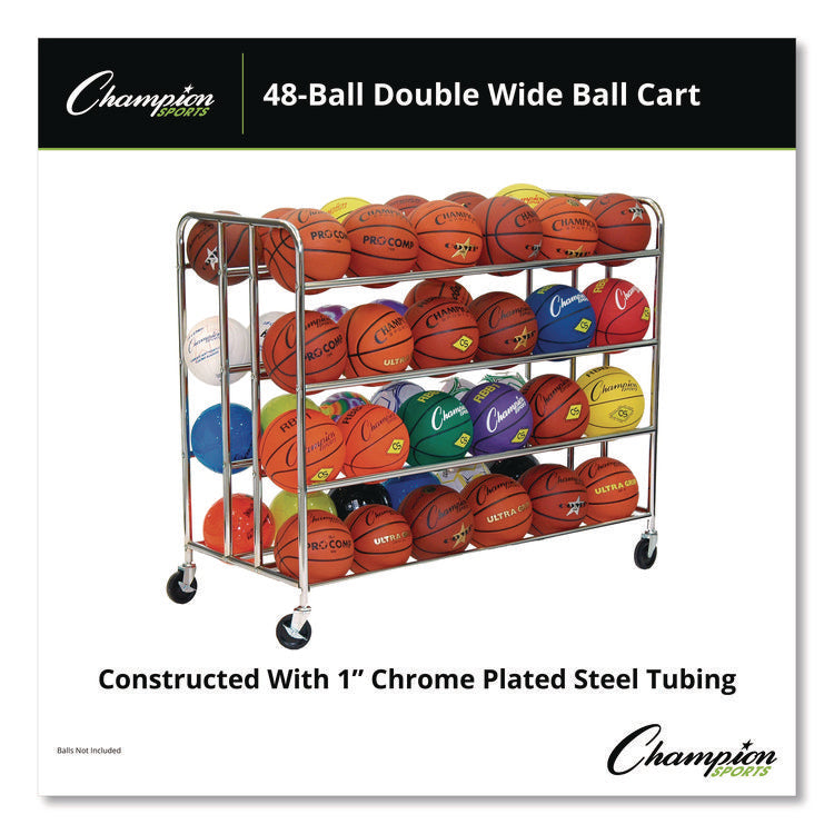 Store all of your basketballs or playing balls with this Champion Sports Double Wide Ball Cart. This go-to rack, constructed with 1" chrome-plated steel tubing, allows you to store and transport your playing balls. The four-tier design holds 48 balls, featuring eight rows with six balls each. Heavy-duty locking swivel casters provide smooth rolling and will not mar gym floors. Material(s): Steel; Overall Material Type: Metal; Color(s): Chrome; Color Family: Silver.
