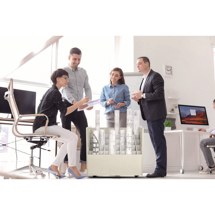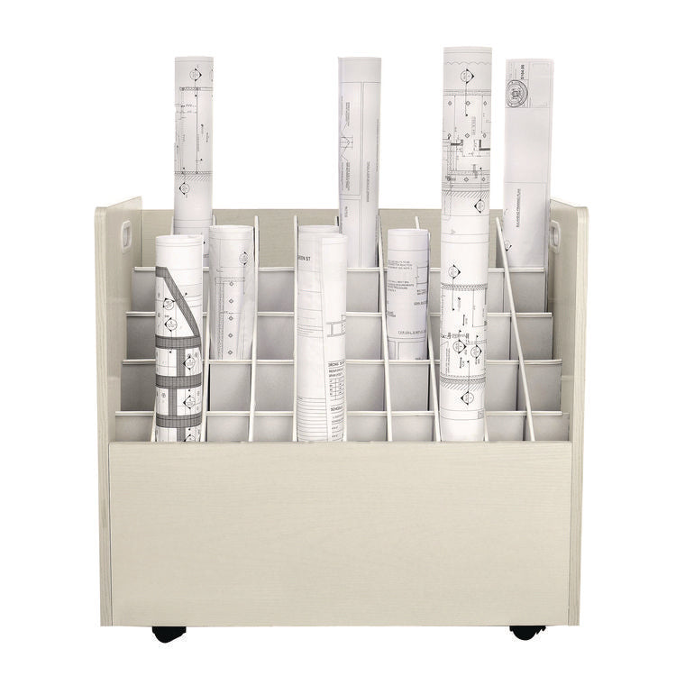 The AdirOffice Mobile Wood Blueprint Roll File holds your rolled blueprints, plan drawings, maps and other large-format documents snugly in square compartments, making it the perfect organizational solution. Sturdy and visually appealing, the unit is expertly crafted using durable wood composite to provide long-lasting strength and use for many years to come. Giving you easy access to all your documents in one compact, sturdy package, its easy to multi-task and efficiently deal with your various projects. The bottom of the cabinet is outfitted with four swiveling casters to facilitate easy movement of your documents, while side handles make it easy to hold and transport the unit from one location to the next. Color(s): White; Number of Compartments: 50; Overall Width: 30"; Overall Depth: 15.75".