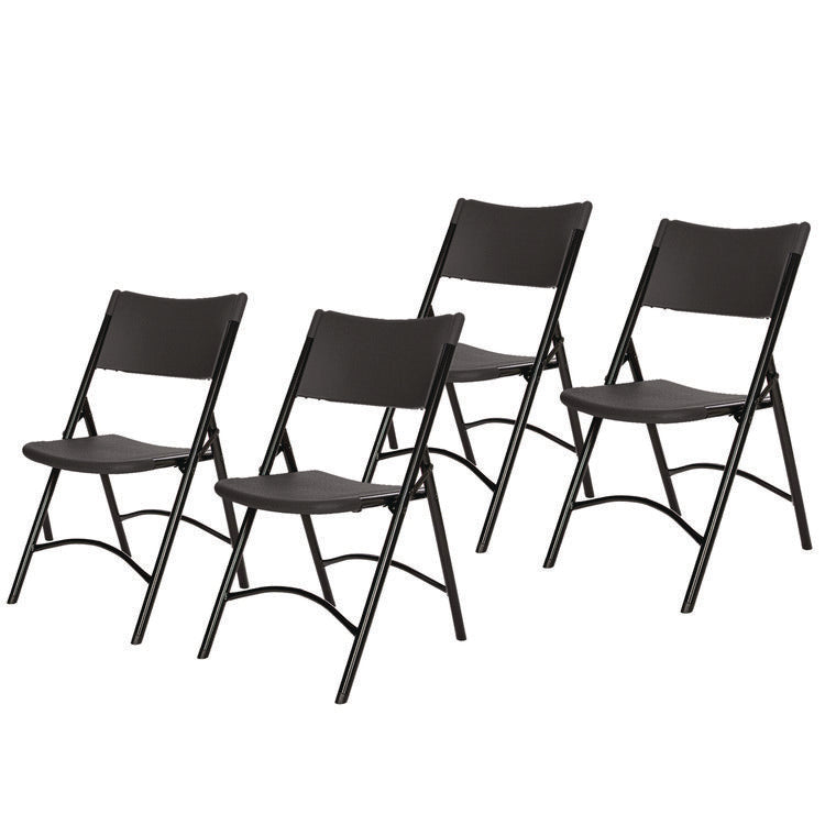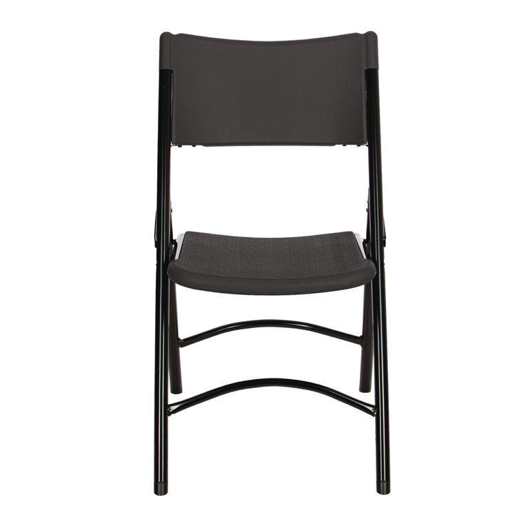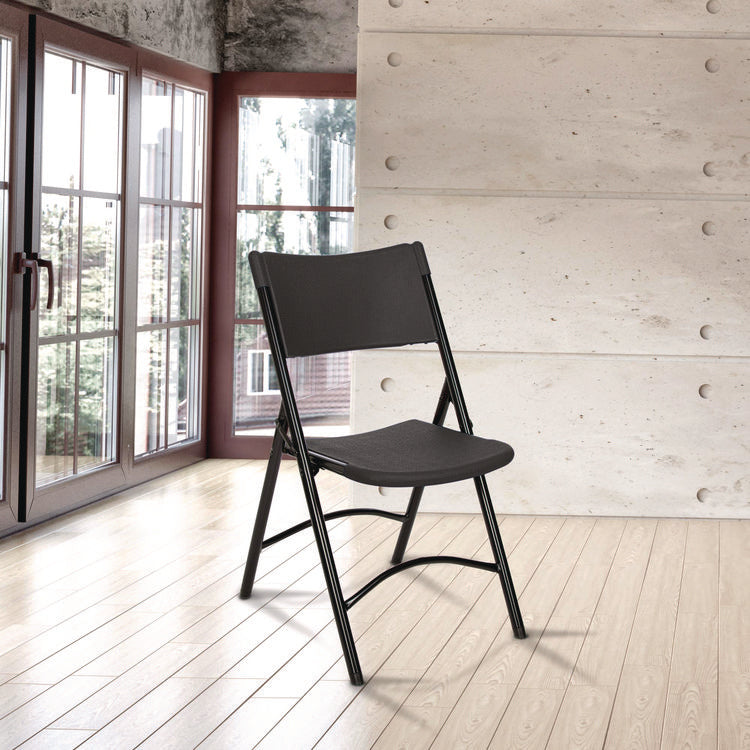 Made for true efficiency and stability, the 600 Series blow-molded, resin-plastic folding chair features a heavy-duty powder-coated 19-gauge tubular frame and a large contoured seat and backrest for your comfort. Two cross braces both in front and in back for added support. V-tip stability plugs provide added reinforcement at the frame's junction and replaceable glides prevent floor damage. Lightweight for easy transport, it is stain-resistant and perfect for easy set-up and take-down, indoors or outdoors. Recommended Application Area(s): Conference & Meeting; General Office & Task; Healthcare; Guest/Reception & Lounge; Seat Color: Black; Back Color: Black; Color Family: Black.