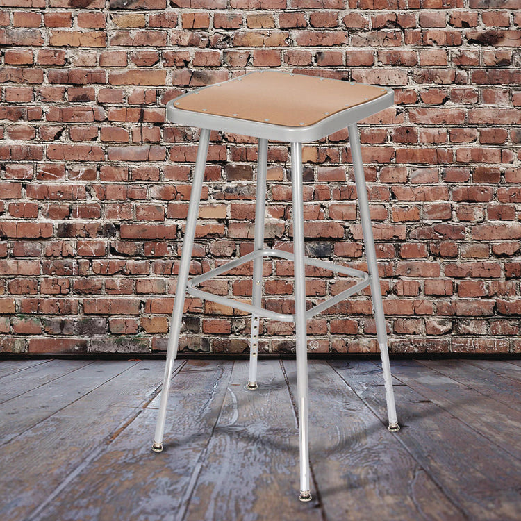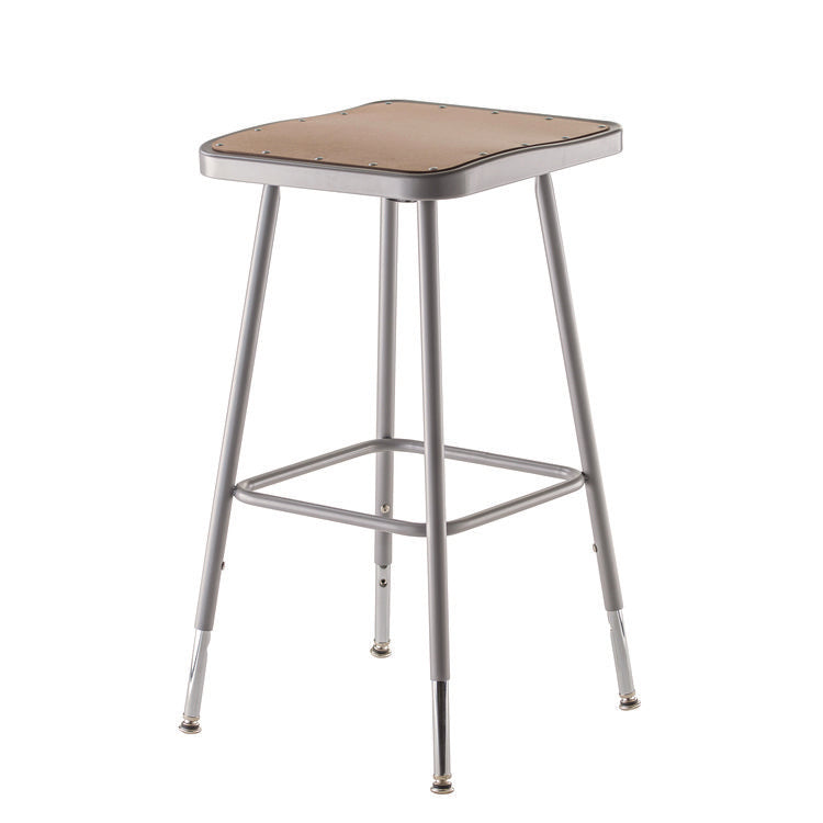 The durable construction and classic design of the 6300 Series heavy-duty square-seat stools are ideal for hands-on educational settings like art rooms, science labs, home economics or shop classrooms. Height-adjustable legs extend from 18 inches to 26 inches in 1-inch increments. These reliable stools feature a strong frame of 18-gauge steel tubing securely welded to the seat pan which is riveted in sixteen places to wide Masonite seats that will not warp, chip or crack as they provide years of dependable use. Footrests are securely bonded to each leg with four spotweld contact points. Recommended Application Area(s): Assembly/Repair & Technical Task; Classroom & Training; Seat Color: Brown; Color Family: Brown; Arms Included: No.