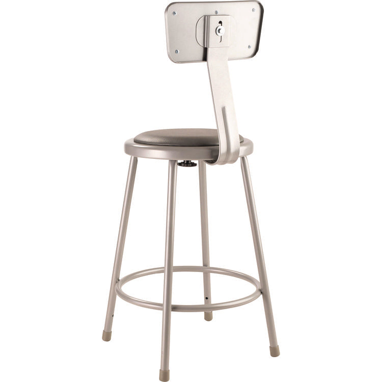 The fortified construction and soft comfort of the 6400 Series heavy-duty padded stools with backrests are ideal for hands-on educational settings like art rooms, science labs, home economics or shop classrooms. This reliable stool features a sturdy frame of 18-gauge steel tubing securely welded to a 14" diameter seat pan. Riveted through the steel pan are 0.5" thick vinyl cushioning that will provide years of dependable use. Footrest ring is securely bonded to each leg with four spotweld contact points. The padded adjustable backrests can be moved two inches up/down and forward/back. Recommended Application Area(s): Assembly/Repair & Technical Task; Classroom & Training; Seat Color: Gray; Color Family: Gray; Arms Included: No.