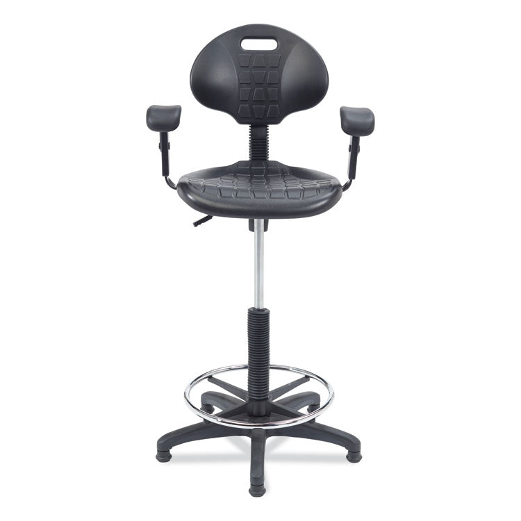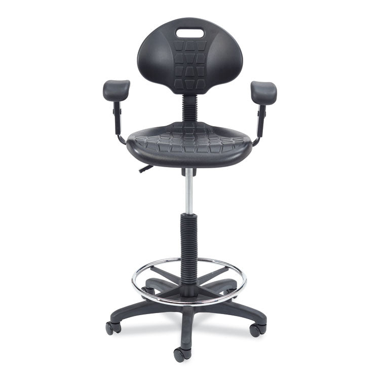 Designed with beauty, strength and functionality in mind, the 6700 Series Adjustable Height Polyurethane Task Stool with Arms from NPS® delivers a unique blend of grace, durability and practicality to fulfill your professional seating demands. Heavy-duty, 1.25-inch thick padded seat features a waterfall edge to provide plush comfort. Puncture- and chemical-resistant polyurethane material cleans easily. Chrome accents enhance the stool's overall aesthetic appeal, while adjustable arms, a comprehensive control set and a seat back handhold grip provide greater comfort and easy maneuverability. Ships with both casters and glides to provide additional versatility. Recommended Application Area(s): Assembly/Repair & Technical Task; General Office & Task; Seat Color: Black; Back Color: Black; Color Family: Black.
