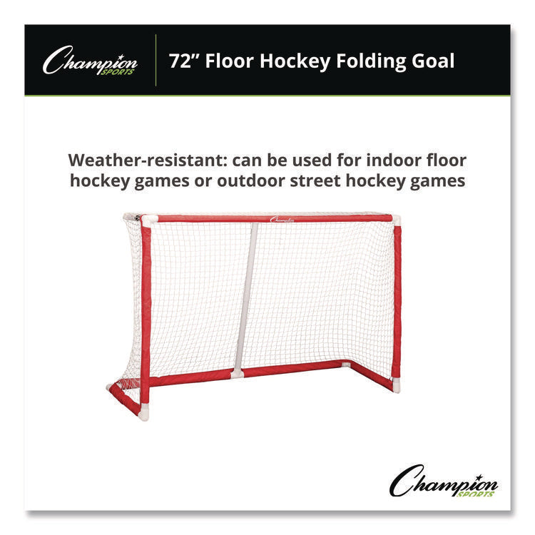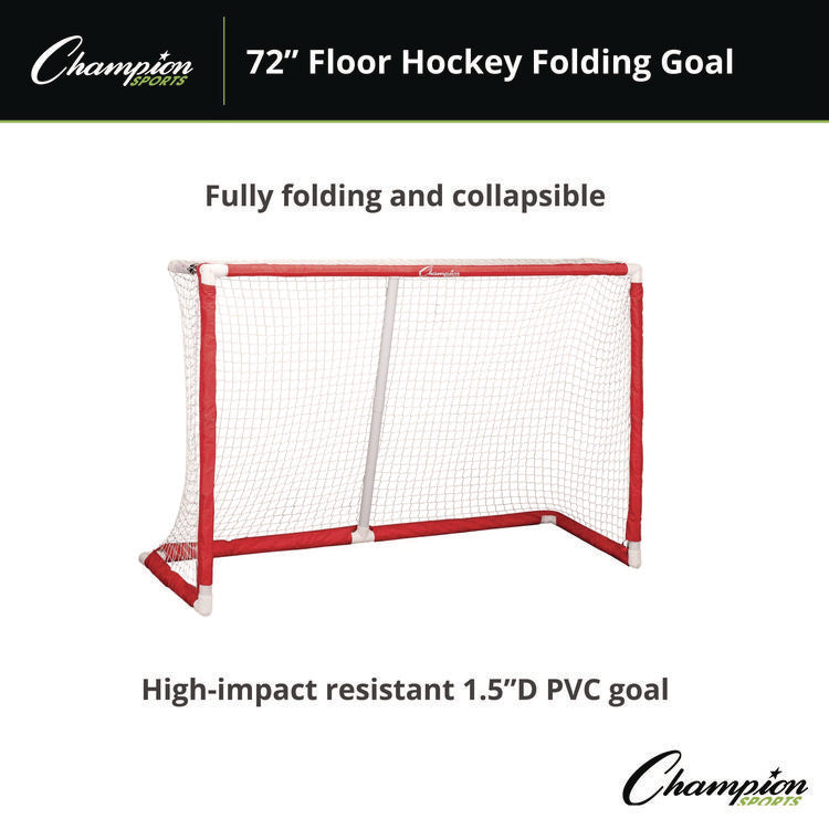 Made with 1.5" PVC material and a heavy-duty nylon sleeve, the Champion Sports 72 Inch Floor Hockey Collapsible Goal is weather-resistant, meaning it can be used for indoor floor hockey games or outdoor street hockey games. The custom fittings and fully foldable design allow the top and bottom of the hockey net to collapse into a convenient size for storage and transportation, making it simple to move from the playground or the court to storage. Length: 24"; Width: 72"; Diameter: 1.65"; Material(s): PVC; Nylon.