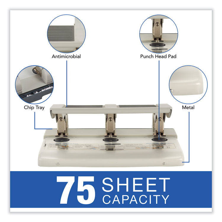 75-Sheet Heavy-Duty High-Capacity Three-Hole Adjustable Punch, 9/32" Holes, Putty/gray