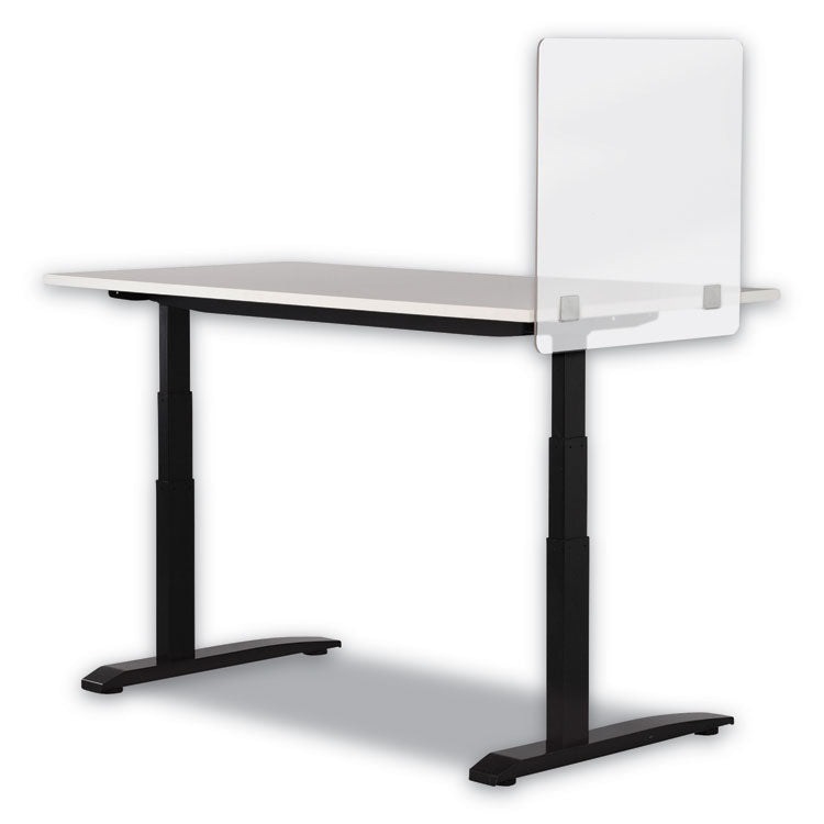 Support social distancing and help workers, customers and guests reduce their exposure to droplets produced by coughing, sneezing and talking by installing Wellness Panels from Safco Products in your office, small business, clinic or hospital. Designed to establish a physical barrier between people to help reduce the spread of germs, each panel is sold separately. Combine two panels to create corner "L" shapes for personal desks or service counters or add a third to build a more isolated, three-sided cove workstation. Install panels on flat-edged surfaces that measure one inch thick or greater using the included screws and steel brackets. Each panel features acrylic construction for simple cleaning and maintenance. Screwdriver required for installation and not included. Frosted—Balance bolstered privacy with allowing more light into the workspace. Color(s): Frosted; Overall Width: 23.5"; Overall Depth: 2.5"; Overall Height: 23.5".