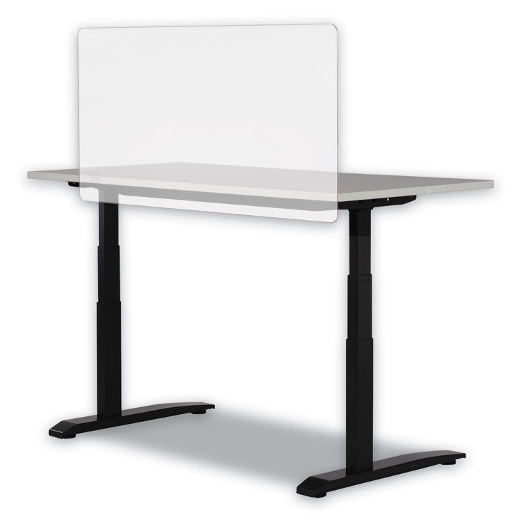 Support social distancing and help workers, customers and guests reduce their exposure to droplets produced by coughing, sneezing and talking by installing Wellness Panels from Safco Products in your office, small business, clinic or hospital. Designed to establish a physical barrier between people to help reduce the spread of germs, each panel is sold separately. Combine two panels to create corner "L" shapes for personal desks or service counters or add a third to build a more isolated, three-sided cove workstation. Install panels on flat-edged surfaces that measure one inch thick or greater using the included screws and steel brackets. Each panel features acrylic construction for simple cleaning and maintenance. Screwdriver required for installation and not included. Frosted—Balance bolstered privacy with allowing more light into the workspace. Color(s): Frosted; Overall Width: 47.5"; Overall Depth: 2.5"; Overall Height: 23.5".