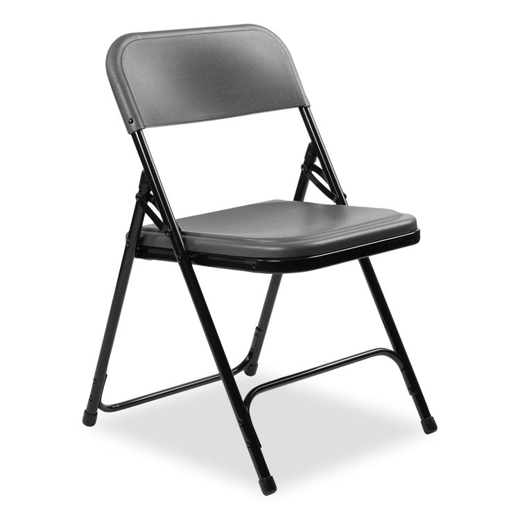 The 800 Series folding chair offers the perfect solution for both indoor and outdoor seating events such as meetings, graduations and receptions. This lightweight institutional-grade chair was made to provide you with the strengths of metal and all the benefits of plastic. The powder-coated 18-gauge tubular steel frame features two double-riveted U-braces-one in front and one in back- to securely support the double-hinged legs. The large seat and backrest are made of comfortable contoured color-impregnated plastic to prevent fading and rusting. Color-coordinated V-tip stability plugs provide added reinforcement at the frame's junction and matching replaceable glides prevent floor damage. Recommended Application Area(s): Breakroom & Foodservice; Classroom & Training; Conference & Meeting; Guest/Reception & Lounge; Seat Color: Charcoal; Back Color: Charcoal; Color Family: Gray.