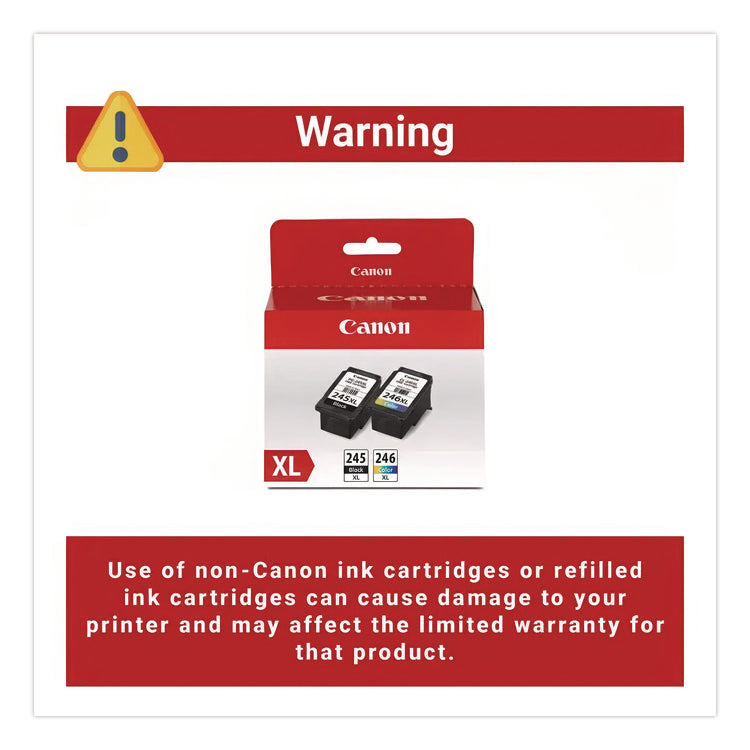 Black ink is used for printing documents on plain paper and ensures sharp black text, and the color ink is used for printing colorful photos and images. XL capacity cartridges can help you save money, print more when you need to and extend the time between replacing ink cartridges. Genuine Canon inks provide peak performance that is specifically designed for compatible Canon printers. Device Types: Inkjet Printer; Color(s): Black; Color; Supply Type: Ink; Market Indicator (Cartridge Number): PG-245XL; CL-246XL.