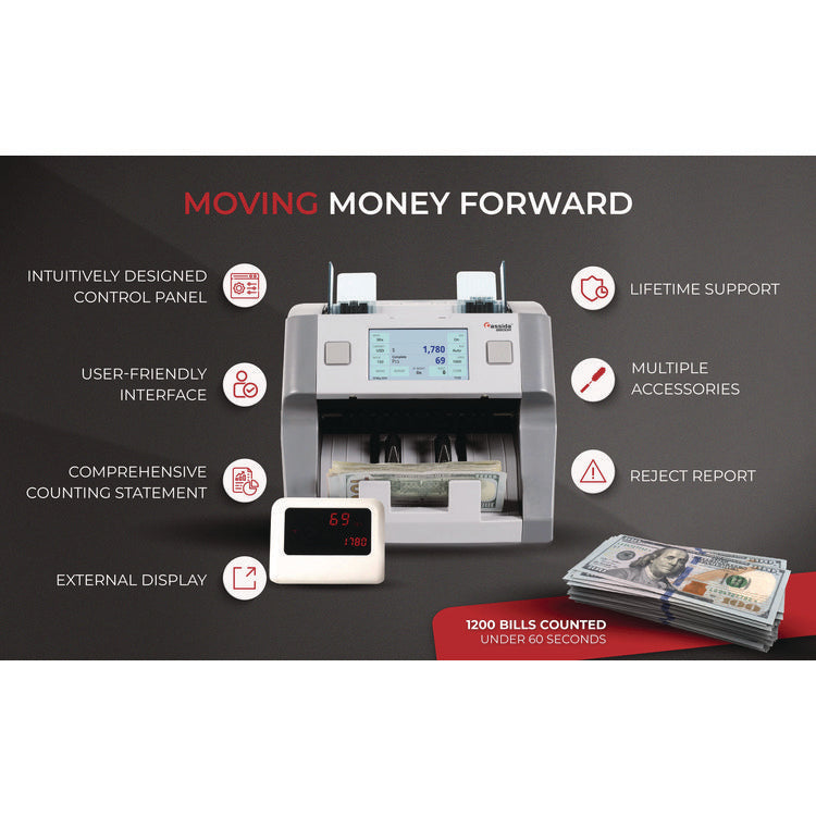 Ensure speed, accuracy, performance and reliability with the help of an 8800R business-grade mixed denomination money counter machine from Cassida. With adjustable speeds of up to 1,200 bills per minute, it helps you complete paper currency handling tasks fast and matches the performance rate you prefer. This mixed denomination bill counter can process your stacks of USD, CAD, MXN, EUR and GBP currencies combined or separately. Apart from the standard Add, Batch, and Add plus Batch, it also has Auto Currency, Multi-Currency and Auto/Manual Start Functions. The bank-grade money counter also has several counting and sorting modes, such as the Sort, which organizes your stack according to currency. Its VSort mode arranges the currencies by value, while the Face and Orient modes stack your bills by front or back side and by orientation. The bill counting machine protects your business with its multi-sensor design with UV, MG, IR, 2CIS, MT, DD, DB and HLF for counterfeit detection and to provide you with an accurate count. It features a large, easy-to-read 3.5" TFT display and an intuitive touch control panel for easy operation. This cash-handling equipment has a solid body with strong materials and is easy to clean and maintain for long-lasting performance. The counter unit includes an external display and dust cover. Cash/Coin Counter Type: Bill Counter; Denomination: CAD; MXN; EUR; GBP; USD; Bill/Coin Capacity: 400; Counting/Sorting Speed: 1,200 Bills/min.