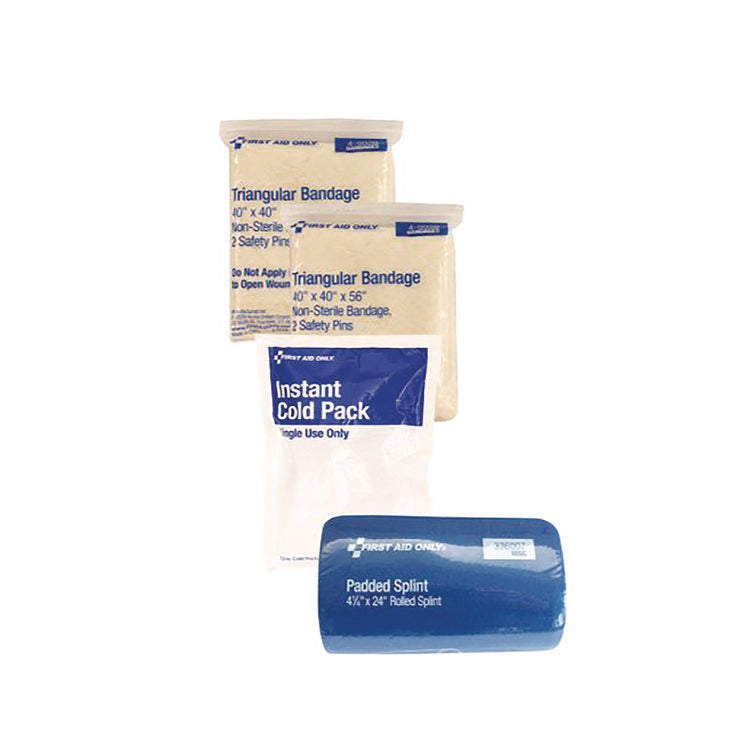 Quick convenient kit has essential supplies to treat CPR, sprains and strains emergencies. Contains CPR face masks along with splints and triangular bandages for sprains and strains. Grab-and-go treatment pack can stand on its own and is easy to carry to an emergency. Each first aid item's intended use is printed on the back of the bag. Bag is resealable. Sold as a separate treatment pack or as a refill for the 91170 Emergency Response Bag. System Capacity: 1 Person System; Number of Pieces: 9; Contains: (1) Cold Pack; (2) CPR Face Shields; (1) First Aid Guide; (2) Nitrile Exam Gloves; (1) Padded Flexible Splint; (2) Triangular Bandages, 40" x 40" x 56"; Case Material: Resealable Plastic Bag.