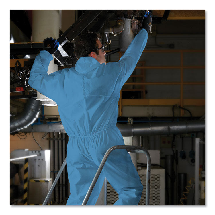 KleenGuard Personal Protective Equipment (PPE) enables rather than inhibits allowing for maximum productivity and safety for you and your employees. KleenGuard A20 Breathable Particle Protection Coveralls are designed to move with you and your employees while protecting against hazardous and non-hazardous dust. These protective garments offer superior particle holdout coupled with unmatched comfort attributes. The A20 fabric is comprised of five layers of stacked barrier protection (SMMMS) against hazardous particles. Features to provide more protection include the seamless front (for primary exposure area), 1 inch zipper flap, an elastic back and elastic wrists and ankles. They feature Reflex design, which offers excellent fit and freedom of movement. The seamless front provides more protection to the primary exposure area. They are a popular choice for dusty environments such as laboratories and remediation, as well as pesticide applications and as decontamination modesty garments. Making the right Personal Protection choice is difficult. Perform with distinction with KleenGuard Personal Protective Equipment (PPE). Hood and Boots. Apparel Type: Coverall; Material(s): MICROFORCE* Barrier SMS Fabric; Color(s): Blue; Color Family: Blue.