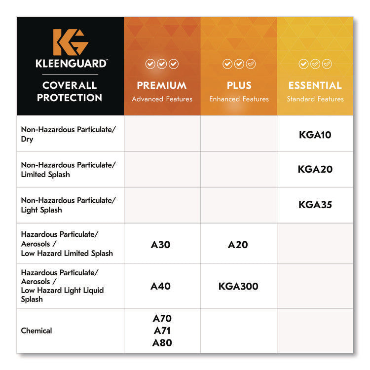 KleenGuard™ Personal Protective Equipment (PPE) enables rather than inhibits allowing for maximum productivity and safety for you and your employees. If you or your employees are working in an environment where liquid and dry chemicals are present, you need the right protection equipment. You can trust the KleenGuard™ A70 Chemical Spray Protection Coveralls for comfort and protection. They are made of a 1.5 mil polyethylene-coated fabric, which is resistant to many water-based liquids, greases and oils and liquid chemical splashes. They feature a wick-away lining for enhanced comfort, a liquid-resistant, extra-long zipper and a taped, sealable zipper flap. The seamless front gives the wearer more protection in the primary exposure area, and the REFLEX Coverall Design offers excellent fit and freedom of movement. Making the right Personal Protection choice is difficult. Perform with distinction with KleenGuard™ Personal Protective Equipment (PPE). Elastic Wrists, Ankles, Hood. Apparel Type: Coverall; Material(s): Polyethylene-Coated Fabric; Color(s): Yellow; Color Family: Yellow.