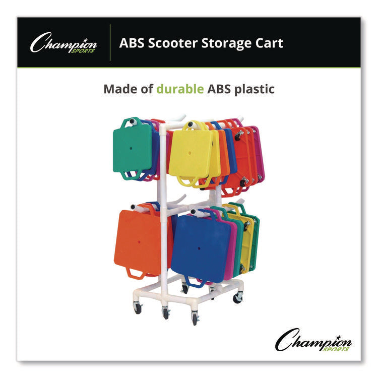 The Champion Sports Scooter Storage Cart helps you effortlessly transport scooters to any play area. Made of durable ABS plastic, this cart can hold up to 48 scooters in a hanging position by their handles. This cart sits on heavy-duty, non-marring swivel casters and a great way to keep your equipment clean and organized—making it a must for schools and recreational clubs. Material(s): Plastic; Overall Material Type: Plastic; Color(s): White; Color Family: White.