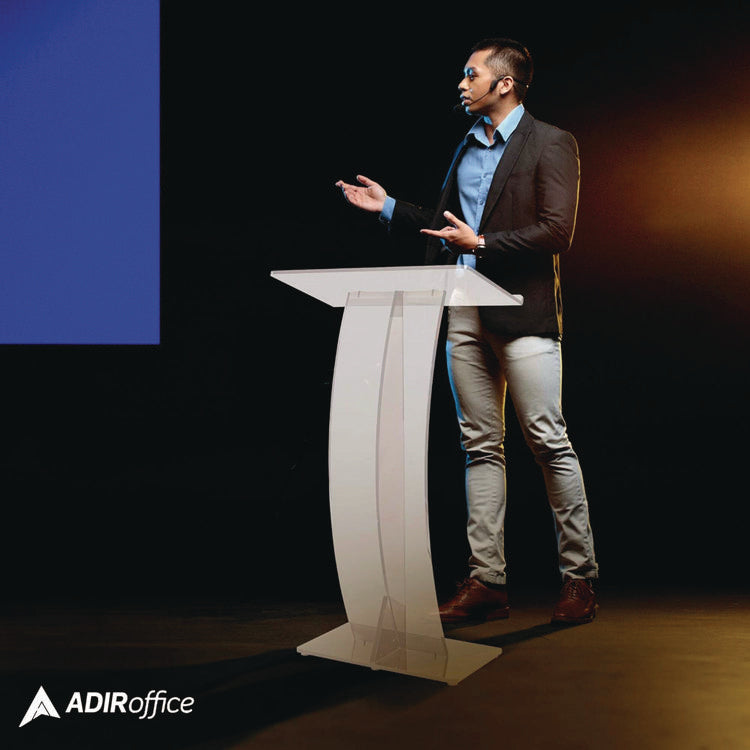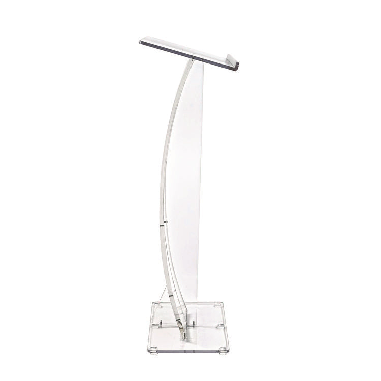 Give a professional touch to any presentation with this lectern. Adding panache and pizzazz in any setting, speakers can make their positions clear from a position of power while keeping things organized and running smoothly. Made with heavy-duty, acrylic to assure a long service life. Even though acrylic is lightweight, it boasts great strength and effortlessly shrugs off point-making pounding if you suddenly become passionate about your topic! The smooth, sculptured structure will complement any setting. It boasts an elegant, slanted stem to give it a stylish, professional look and stands tall for the right comfort during any presentation. The generous, lip-equipped surface is angled for easy reading, keeping your notes in place when you're reading so your presentation goes off without a hitch. Meanwhile, the large base provides stability and is outfitted with four acrylic base pads to protect flooring from scratches and unsightly scuff marks, as well as to facilitate easy repositioning. With the included assembly instructions, screws and screwdriver, you should have this attention-getting lectern ready for service in less than 15 minutes. Debating societies, classrooms, trade show event sponsors, religious and professional organizations, restaurants and other establishments can all put this podium to good use. Speaking from this sturdily constructed, stylishly designed and easily positioned podium will set a leadership tone anywhere presentation topics are key to drawing and holding audiences. Color(s): Clear; Color Family: Clear; Wired/Wireless: Wireless; Overall Width: 26.75".
