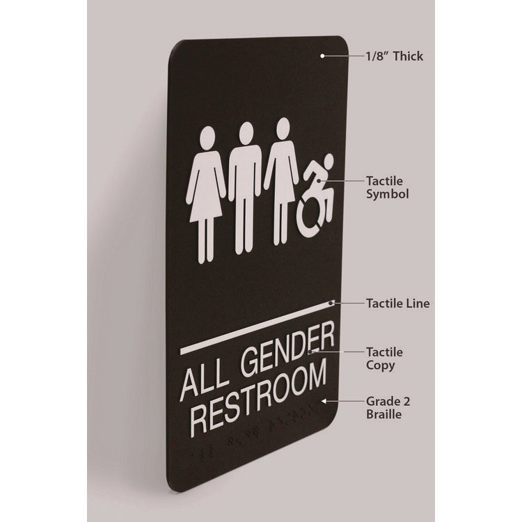 Universally and easily recognizable white graphics. Raised tactile graphics with Grade 2 Braille. Meets Americans with Disabilities Act (ADA) requirements. Includes double-side adhesive tape for mounting to door or wall. Size: 6" x 9"; Message(s): All Gender Restroom; Material(s): Injection Molded Rigid Plastic; Orientation: Vertical.