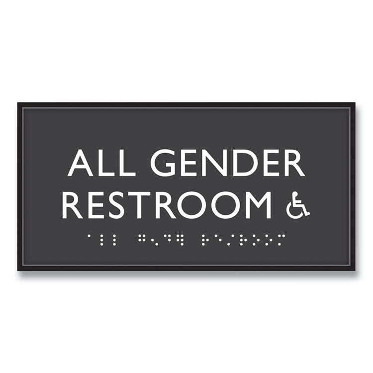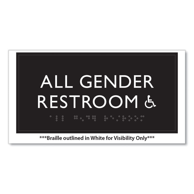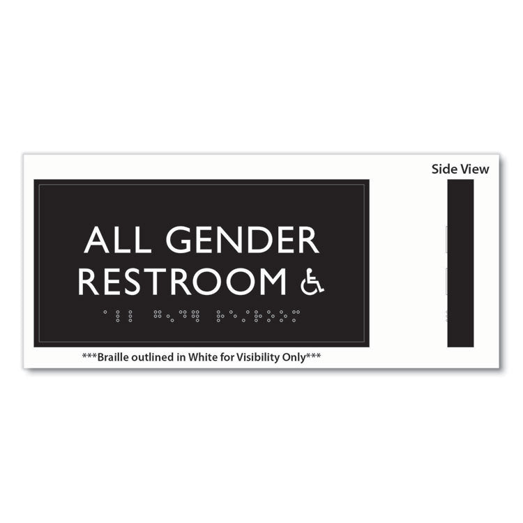Universally and easily recognizable white graphics. Raised tactile graphics with Grade 2 Braille. Meets Americans with Disabilities Act (ADA) requirements. Includes double-side adhesive tape for mounting to door or wall. Frame Color: Black; Size: 4 x 8; Message(s): All Gender Restroom Accessible; Material(s): Plastic.