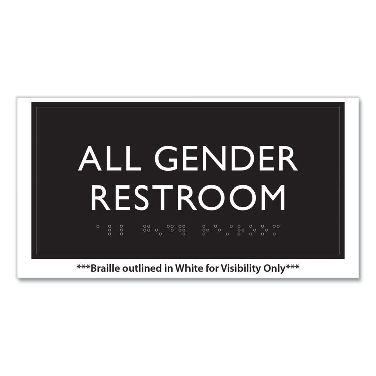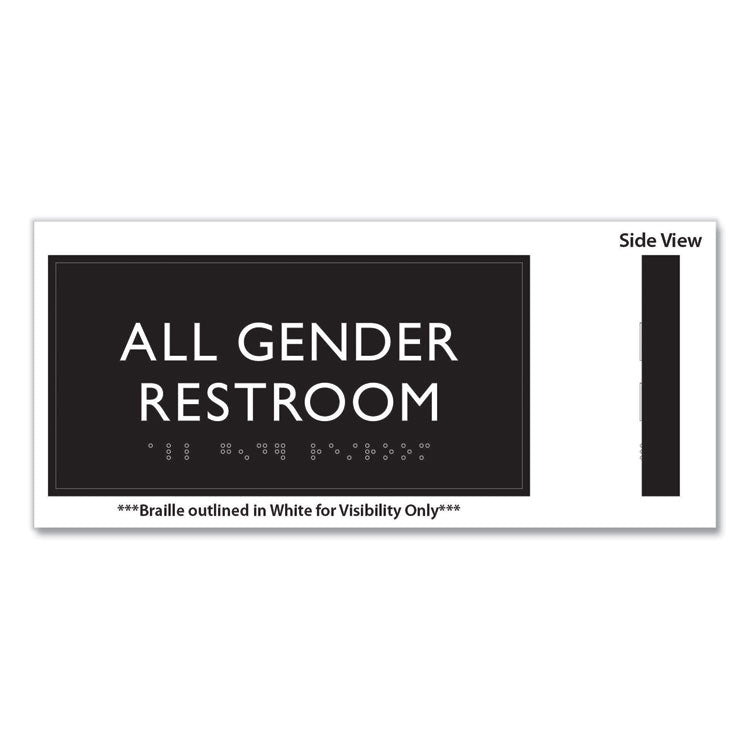Universally and easily recognizable white graphics. Raised tactile graphics with Grade 2 Braille. Meets Americans with Disabilities Act (ADA) requirements. Includes double-side adhesive tape for mounting to door or wall. Frame Color: Black; Size: 4 x 8; Message(s): All Gender Restroom; Material(s): Plastic.