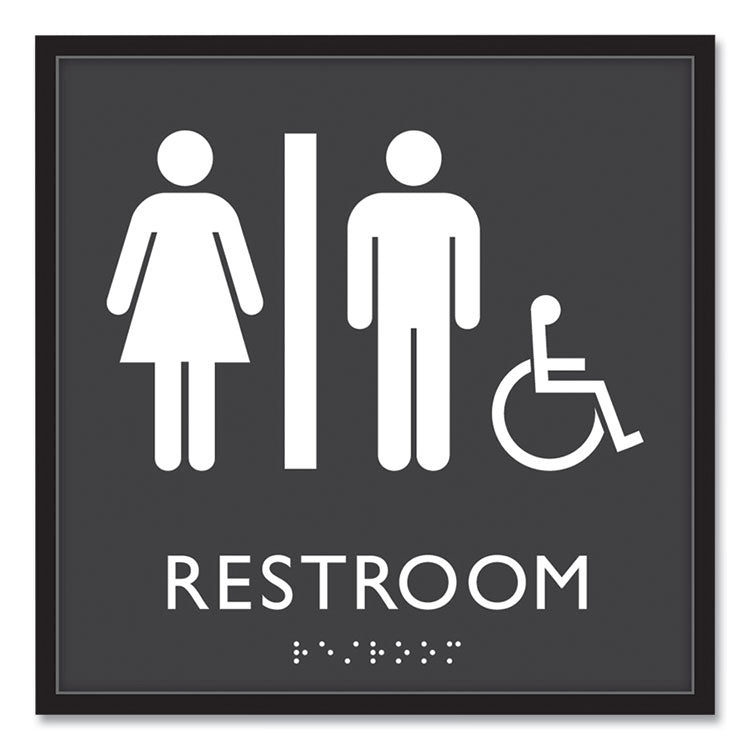 Universally and easily recognizable white graphics. Raised tactile graphics with Grade 2 Braille. Meets Americans with Disabilities Act (ADA) requirements. Includes double-side adhesive tape for mounting to door or wall. Frame Color: Black; Size: 8 x 8; Message(s): Unisex Accessible Restroom; Material(s): Plastic.