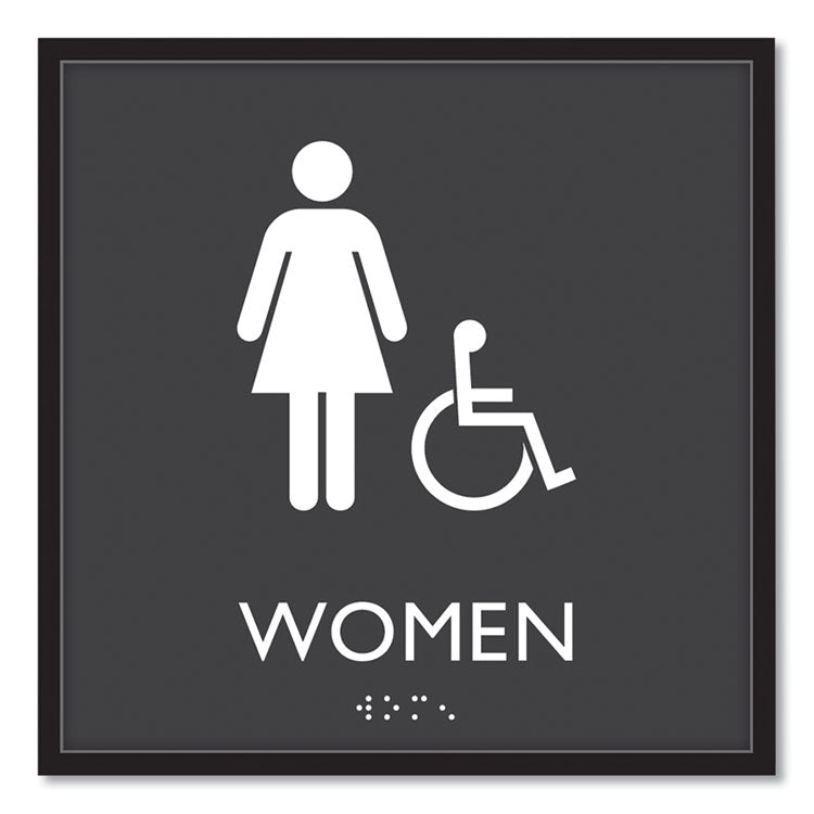 Universally and easily recognizable white graphics. Raised tactile graphics with Grade 2 Braille. Meets Americans with Disabilities Act (ADA) requirements. Includes double-side adhesive tape for mounting to door or wall. Frame Color: Black; Size: 8 x 8; Message(s): Women Accessible; Material(s): Plastic.