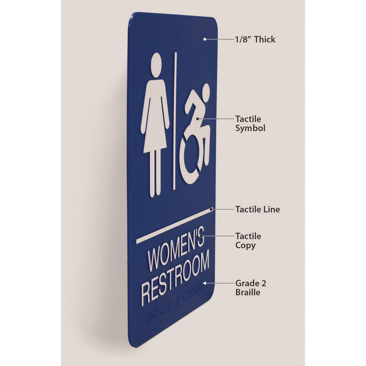 Universally and easily recognizable white graphics. Raised tactile graphics with Grade 2 Braille. Meets Americans with Disabilities Act (ADA) requirements. Includes double-side adhesive tape for mounting to door or wall. Size: 6" x 9"; Message(s): Women's Restroom; Material(s): Injection Molded Rigid Plastic; Orientation: Vertical.