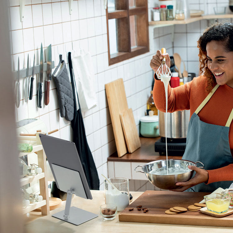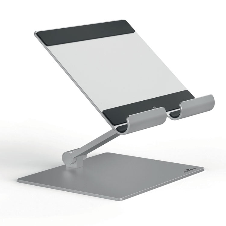 Upgrade your work-from-home or remote office setup with the Adjustable Tablet Stand Riser. Allows you to achieve a healthy working posture by providing flexible height and tilt angle adjustability. Say goodbye to neck and back pains caused by slouching over your tablet for extended periods. More than just a simple laptop holder desk. It also converts your laptop into a desktop monitor, enabling you to connect an external keyboard and mouse for added comfort and productivity. Sturdy and stable, this laptop stand riser has non-slip rubber surfaces that prevent your device from scratches and slipping. It is also portable, foldable and compatible with most tablets and smartphones. Whether you're working from home or on the go, you can take this portable laptop riser with you and work comfortably wherever you do. Features air holes and an aluminum plate for improved heat extraction, which keeps your laptop cool even during extended use. For Use With: Smartphones; Tablets; Accessory Type: Tablet Stand; Material(s): Aluminum; Color(s): Silver.