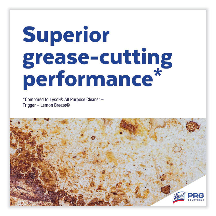 Optimize your cleaning practices with the ergonomic trigger spray bottle and the advanced, all-purpose cleaner that offers excellent grease cutting performance. The advanced deep clean all-purpose cleaner destroys grease and grime with ease. Designed for commercial use, Lysol® Professional Advanced Deep Clean All-Purpose Cleaner can help you deep clean, disinfect, and degrease high-touch surfaces all in one product. Drive operational efficiency with the convenient trigger spray bottle and a solution that offers efficient cleaning and disinfecting at the same time. Cut through stubborn stains and spills using this advanced multi-purpose cleaner. Lysol® kills 99.9% of germs and viruses (including the virus that causes COVID-19) when used as directed on hard, non-porous surfaces. Application: Disinfectant/Cleaner; Applicable Material: Ceramics; Enamel; Fiberglass; Laminates; Metal; Plastic; Vinyl; Chemical Compound: Quanternary Ammonium Compounds; Benzyl-C12-16; Alkyldimethyl; Chlrorides; Dirt Types: Bacteria; Dust; Germs; Grease; Grime; Viruses.