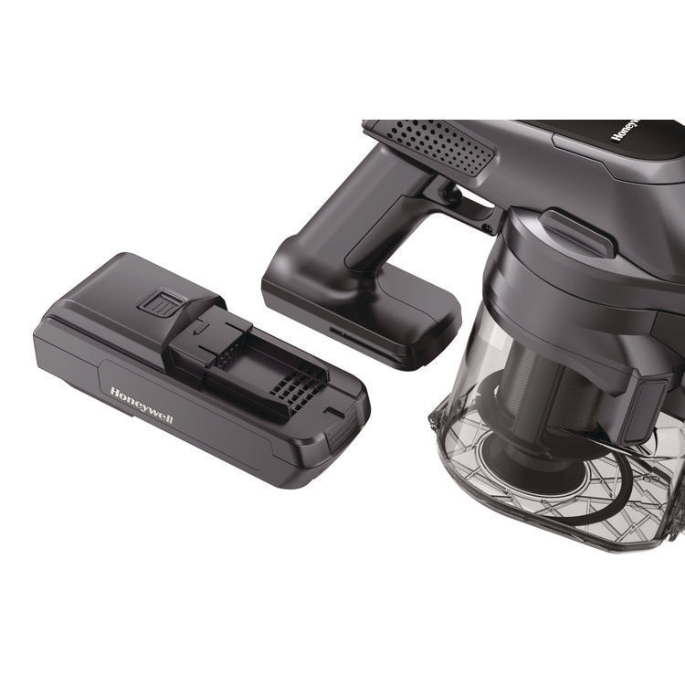 Experience powerful suction in a lightweight form with the Honeywell VC16 Aeromax Pro cordless vacuum. This handheld vacuum includes eight tools for optimal cleaning convenience, with its lightweight, cordless design making it easy to carry around and clean every corner. The advanced 600 W digital motor technology delivers powerful suction up to 185 air watts, optimizing energy efficiency. Vacuuming becomes more enjoyable thanks to the innovative tangle-resistant design. For greater clarity, a full-length natural Brite White LED light strip adorns both the carpet and hard floor rollers, with an additional LED spotlight on the handheld body. The vacuum also features advanced cyclonic tank design, which, combined with the HEPA filter, provides up to 99.9% dust and air separation. Voltage: 25.2 V; Power: 600 W; Tank Capacity: 550 mL; Color(s): Dark Silver.