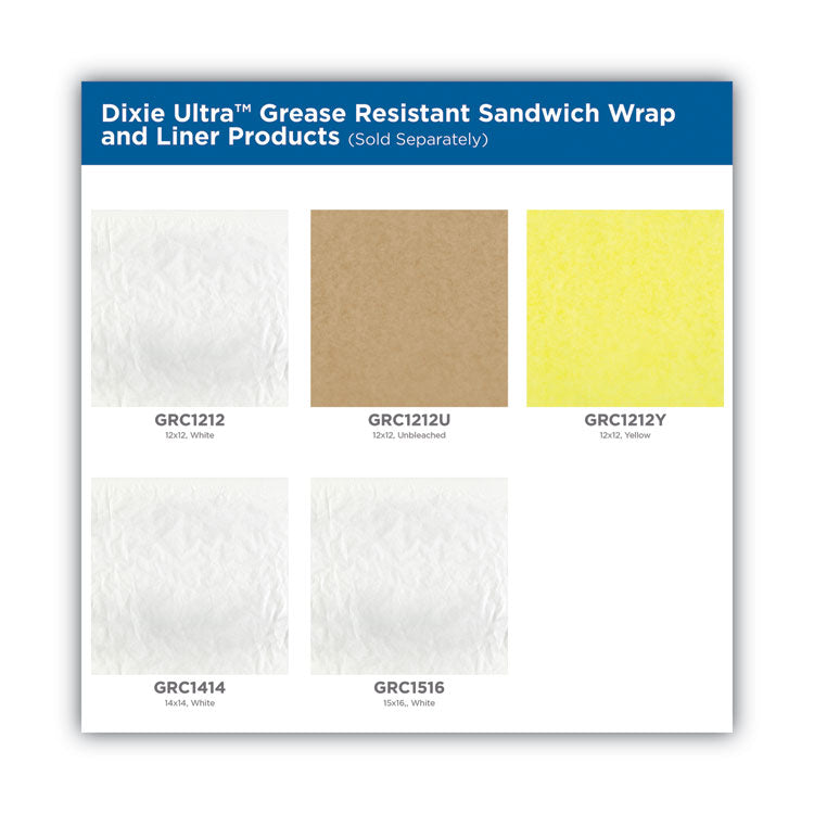 Dixie Ultra Grease Resistant Sandwich Wrap and Liner is a boxed alternative to traditional wax-based (OGR) products, using a starch-based coating instead of wax. It is a part of a line of Dixie Ultra Grease Resistant Sandwich Wrap and Liner that replaces Quik-Rap® with the same sized wraps and case counts and a part of a line of Dixie® wax-alternative papers and insulated wraps and liners. This oil and grease resistant sheet offers protection for greasy foods. Material(s): Dry Waxed Paper; Length: 14"; Width: 14"; Product Packaging: Box.