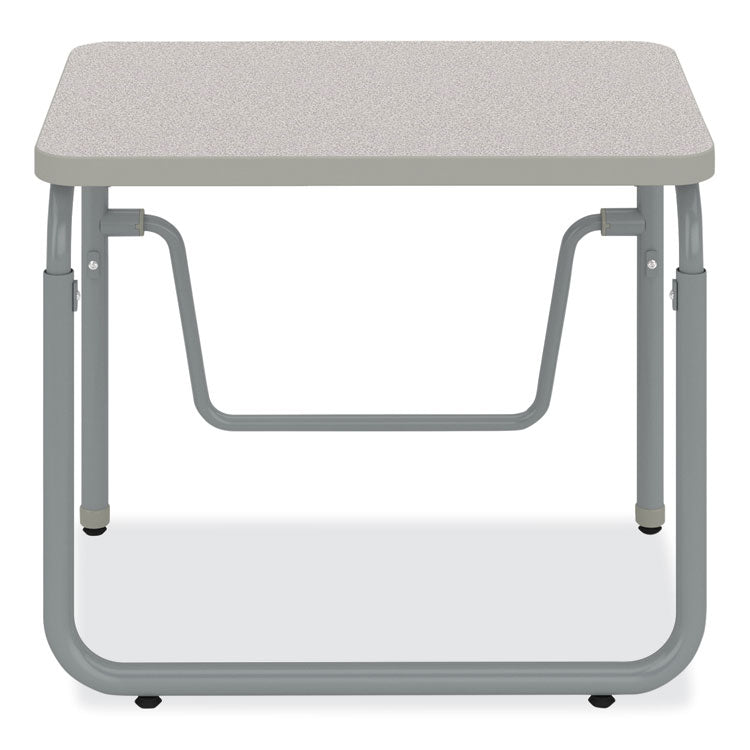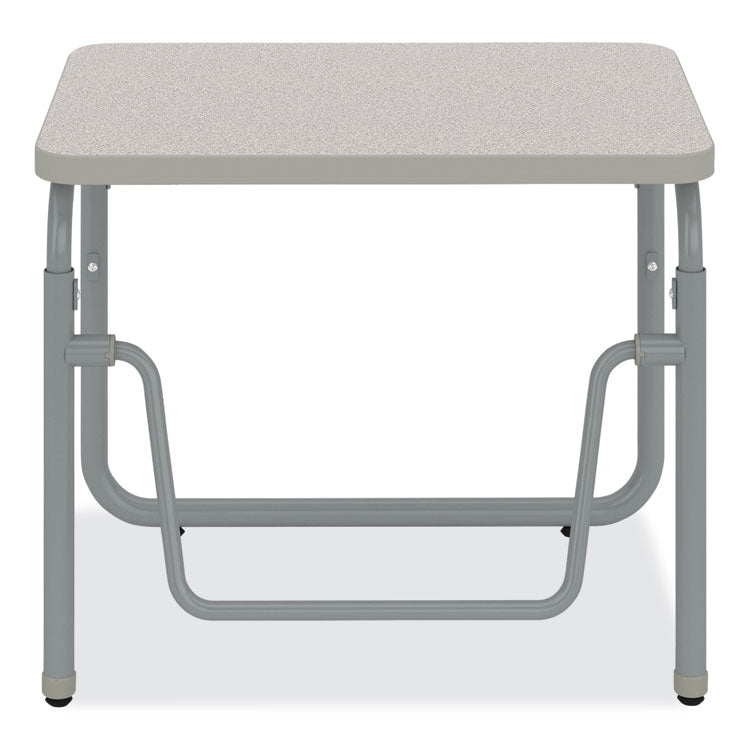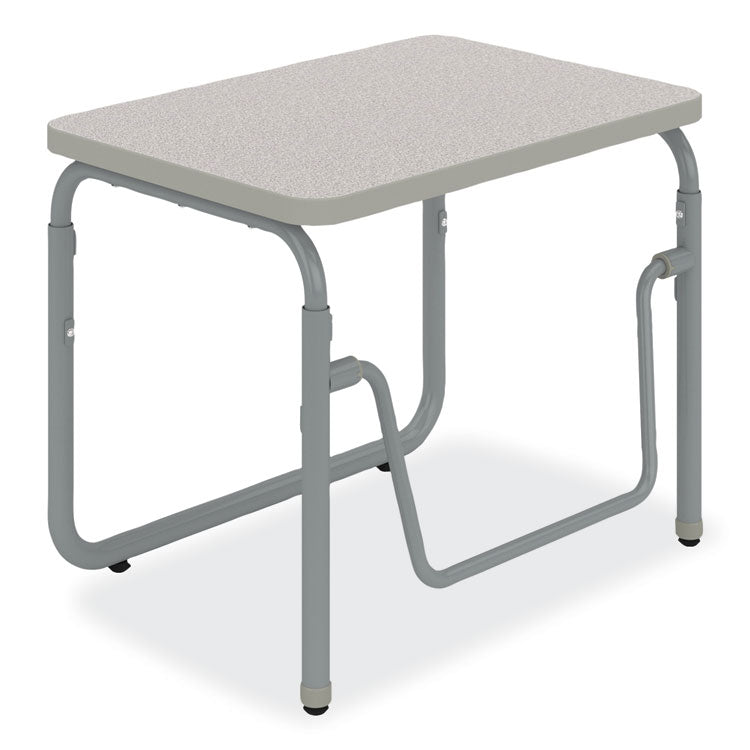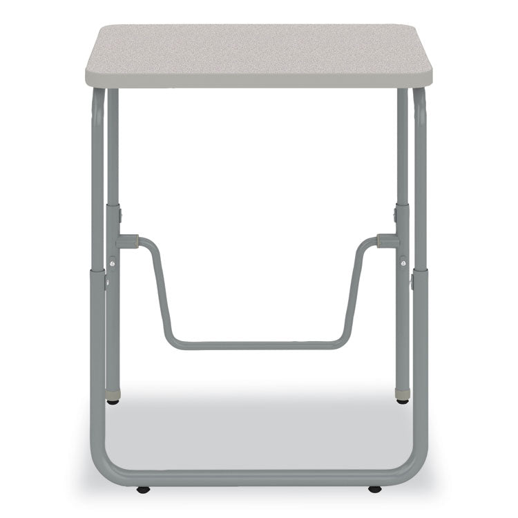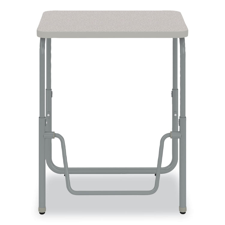 Encourage healthy movement and provide convenient storage with the AlphaBetter 2.0 height-adjustable student desk that features a high-pressure laminate top. This desk comfortably accommodates students of all sizes as they work or sketch ideas. A pendulum footrest allows students to redirect excess energy and continue to move, even as they sit, providing ergonomic support, increasing comfort, and promoting cardiovascular health. Great for boosting productivity and focus, this student desk has the added benefit of optional casters for better mobility throughout the classroom. Height adjusts accommodating students in 5th grade and up as well as adults at seated and standing heights. Series Name: Safco® AlphaBetter® 2.0; Worksurface/Base Color: Pebble Gray; Color Family: Gray; Worksurface Shape: Rectangular.