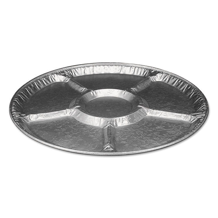Aluminum embossed lazy susan serving trays provide uncompromising foil quality along with an optimal display of goods. Handle freezer to oven temperatures. Used for hot or cold foods. Perfect for buffet settings. Food Container Type: Tray; Material(s): Aluminum; Material Type: Aluminum; Color(s): Silver.