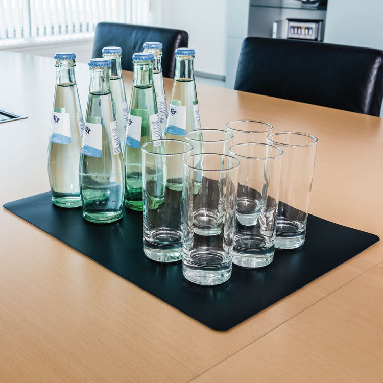 Protect your desk with the DURABLE® Anti-Slip Contoured Edge PVC Desk Pad. Crafted with convenience in mind, this desk pad is designed to withstand the rigors of daily use and to protect your desk from scratches, stains, spills, heat and scuffs. The perfect solution whether you're working from home or in a commercial workspace, the sleek black design adds a touch of sophistication to any workstation. The contoured edge takes user comfort to the next level, minimizing wrist strain during extended periods of work, making it an ideal choice for professionals who have long workdays. The soft, anti-slip back ensures that the desk pad stays securely in place, enhancing stability during use. This feature makes it especially well-suited for dynamic work environments where movement is constant, preventing any unwanted shifting or slippage. Transform your desk with the DURABLE® Anti-Slip Contoured Edge PVC Desk Pad-a reliable, durable, and aesthetically pleasing addition to any home or commercial office space. Width: 20.5"; Depth: 25.5"; Base Color: Black; Material(s): PVC.