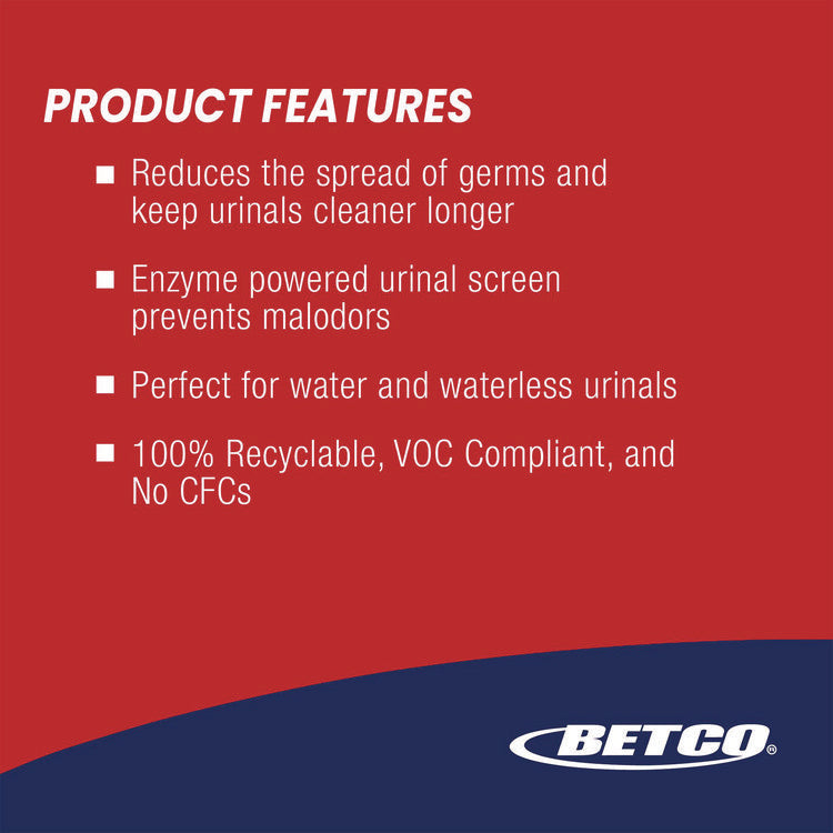 Create cleaner and healthier restrooms with Betco's Anti-Splash Urinal Screens. Reduce the spread of germs and odors in urinals while leaving behind a long lasting fragrance. Patented Micro-Tubed Technology allows the heat activated plastic pores to open with concentrated fragrance when in contact with urine. Deodorizer Type: Urinal Screen; Scent: Lavender; Capacity (Weight): 1 lb; Color(s): Purple.