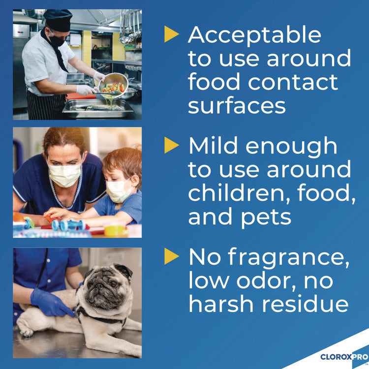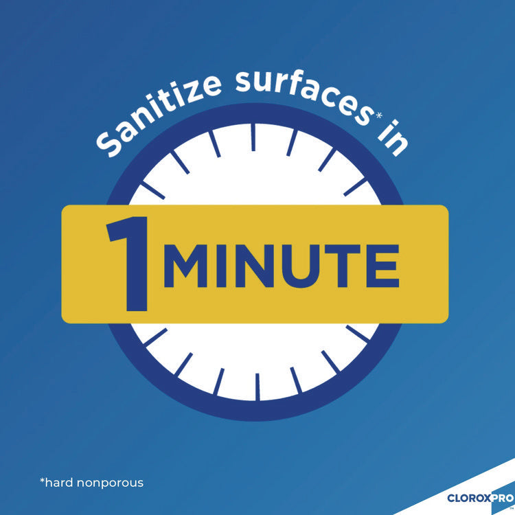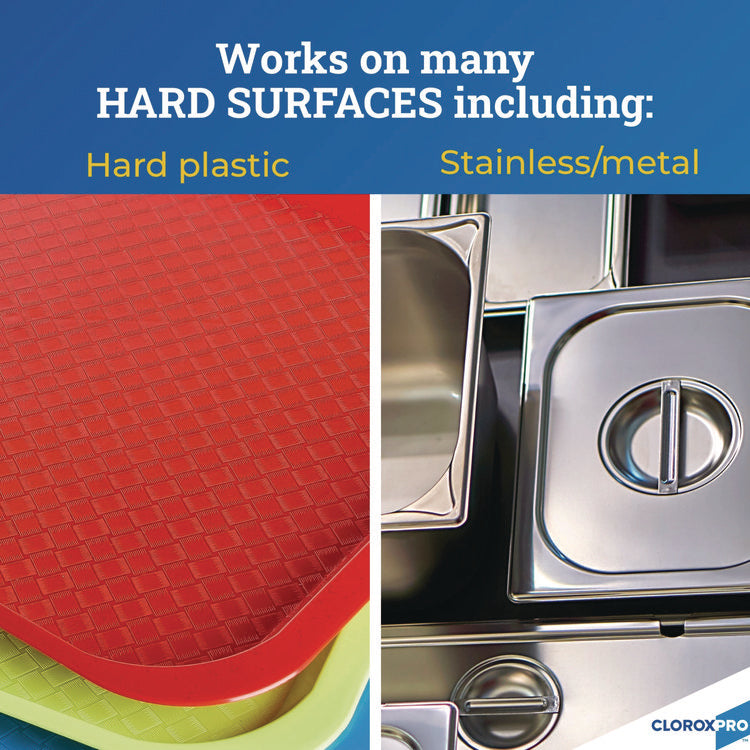 CloroxPro Anywhere Hard Surface Sanitizing Cleaner is designed for use with sprayer devices, including the Clorox Turbo Sprayer Device, to provide full coverage, one-step sanitization of hard surfaces. Certified by NSF, CloroxPro Anywhere Daily Disinfectant and sanitizer kills cold and flu viruses and 99.9% of bacteriaincluding Coronavirus (on hard nonporous surfaces when used as directed) and Influenzawith a spray that's pH-balanced. As a hypochlorous acid based formula, the cleaner is tough on bacteria yet mild enough to use around kids, pets and food, thanks to its low odor and no residue. This sanitizing spray is well suited for commercial spaces and intended for use in airports, public restrooms, day care centers, kennels, laundry rooms, offices and schools. The versatile pH-balanced formula can be used on most surfaces anytime, anywhere. Value PackStock up and save! Application: Sanitizer; Applicable Material: Cement/Concrete; Ceramics; Enamel; Fiberglass; Glass; Grout; Laminates; Metal; Plastic; Sealed/Engineered Stone; Vinyl; Wood; Chemical Compound: Sodium Hypochlorite; Dirt Types: Bacteria; Fungus; Germs; Mildew; Mold.