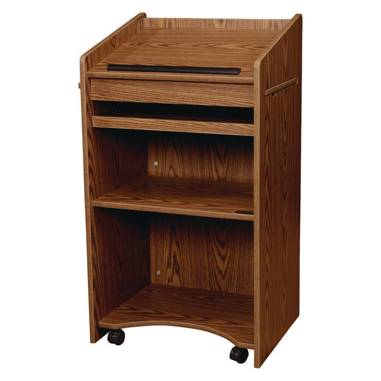 The Model #600 Aristocrat is a bold, executive-style lectern ideal for conference, training, and formal meeting rooms. The high-quality cabinetry is of wood grain thermofused laminate, accented with attractive T-mold edging and features four concealed easy-roll casters (two locking) for smooth mobility. Color(s): Oak; Color Family: Oak; Caster/Glide/Wheel: Four Hidden Casters (Two Locking); Overall Width: 25".