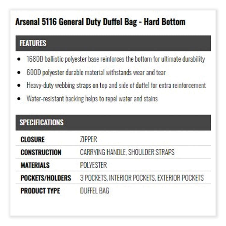 The Arsenal 5116 General Duty Gear Bag is a spacious bag with three compartments to keep everything you need for the workday or the weekend organized. Whether you use it as a way to store your equipment on the job, a hunting bag to trek your gear through the woods, or as a carry-on duffel bag while traveling, you can rely on this utility duffel bag to house and protect your valuables. This gear bag is super durable made with 600 denier polyester material to withstand wear and tear for long-lasting performance. The bottom is reinforced with a 1680 denier polyester. Keep your essentials clean and dry with the reinforced water-resistant backing. Ribbed webbing handles and adjustable padded shoulder straps. A large open main compartment fits all your gear with easy loading and unloading, so nothing is left behind. There are two accessory pockets with zippers on each side to hold smaller items. For Use With: Gear; Color(s): Black; Color Family: Black; Material(s): Polyester.