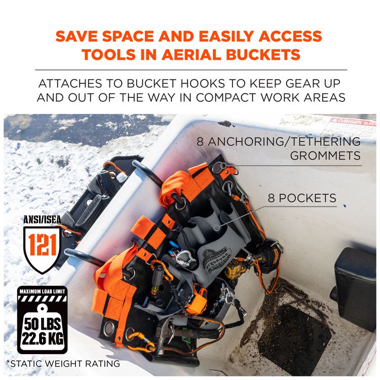The Arsenal 5710 Bucket Truck Tool Board is a multifunctional tool storage, organization and tethering solution designed for work in aerial buckets and other mobile elevated work platforms (MEWPs). With multiple grommets and three straps, it can be securely hung from bucket hooks or affixed to railings—maximizing space in compact work areas by keeping gear up off the floor and out of the way. Unlike lineman tool boards, this board is designed with easily accessible drop-tested d-rings for securely tethering tools to prevent dangerous dropped objects. This durable aerial tool apron is made from water-resistant tarpaulin and also features a detachable roll-up rain cover to keep tools dry and protected in harsh conditions. A padded nylon carrying handle makes for easy transport to and from the jobsite. HTO Type: Tool Board; Material(s): Tarpaulin; Color(s): Gray; Shape: Rectangular.