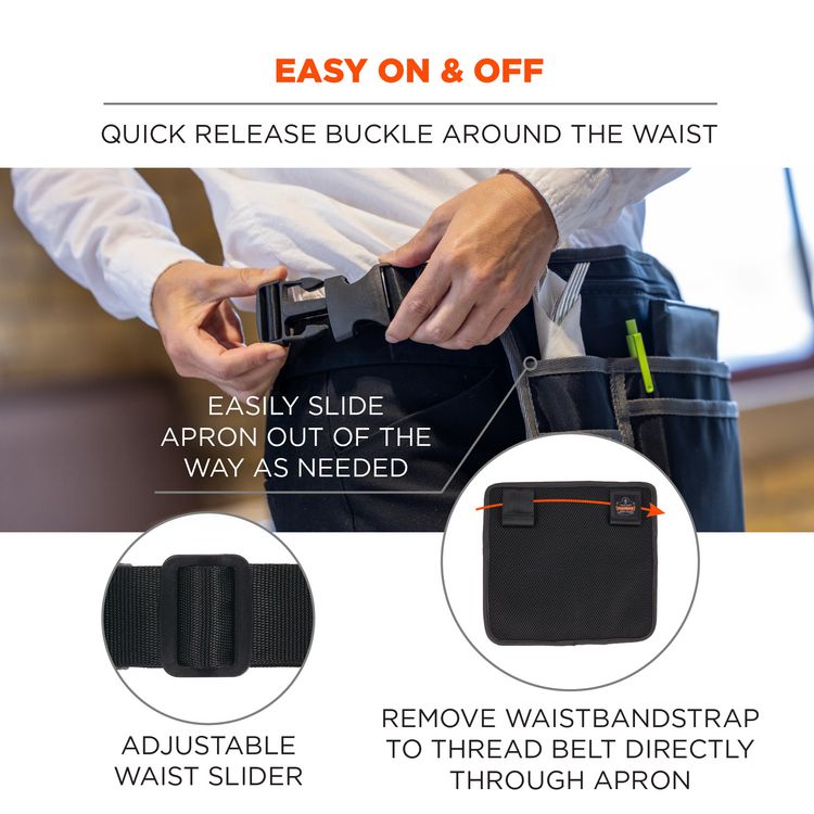 The Arsenal 5716 Server Apron is a convenient and wearable serving pouch designed to keep supplies organized and easily accessible on the job. Constructed with a durable, water-resistant exterior, this server apron is built to last and features a padded backside with mesh material for increased airflow and all-day, comfortable use. Built specifically for restaurant waitstaff, this apron features five pouch pockets on the front to store pens, notepad, straws, silverware and more. A large, deep pocket is designed specially to fit POS handheld devices or check folios and a zippered compartment helps keep personal items, such as cell phones and money, safe and secure. An adjustable waistband belt is included with a quick-release buckle to fit various waist sizes. If preferred, the waistband belt can be removed and the pouch can thread directly through the wearer's belt. This server apron includes two wire cable key rings and two belt clips. Wire cable key rings attach to tools with a captive eye and hang on waistband belt for quick access. Attach to waistband belt and accept wire cable key rings for quick access. Nametag label for personalization. HTO Type: Apron; Material(s): Nylon; Color(s): Black; Shape: Rectangular.
