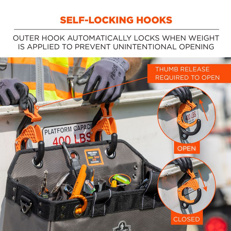 The Arsenal 5846 Bucket Truck Tool Bag with 2" Locking Aerial Bucket Hooks Kit is designed to hang from aerial bucket hooks for secure storage, convenient tool organization, accessible tethering and prevention of dropped objects. Using a hanging tool bag maximizes space in compact buckets by keeping gear off the floor and out of the way. Kit comes with 5844 Bucket Truck Tool Bag and 3178 2" Locking Aerial Bucket Hook (2-pack). Freestanding base and carrying straps for versatile use in and out of buckets. Abrasion-resistant ballistic polyester with heavy-duty nylon webbing straps, nickel-plated grommets and a storm drain. Large interior pockets, nickel-plated tape measure slot and screwdriver slots for small hardware. Durable exterior grommets for bucket hooks and tool lanyards. Standoffs on the side keep bag upright to prevent tools from spilling out when hanging in bucket. 2 Grommets. HTO Type: Tool Bag; Material(s): Polyester; Color(s): Gray; Shape: Rectangular.