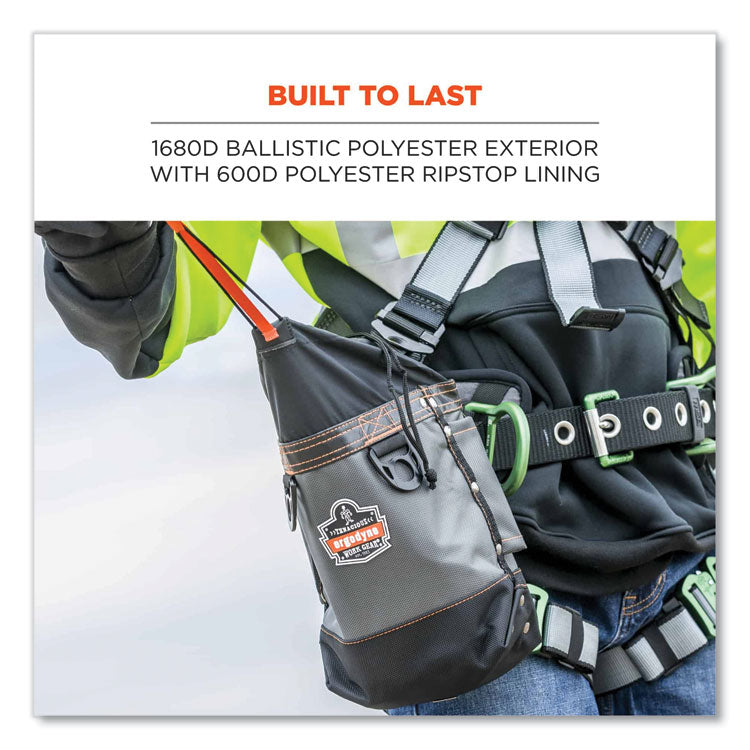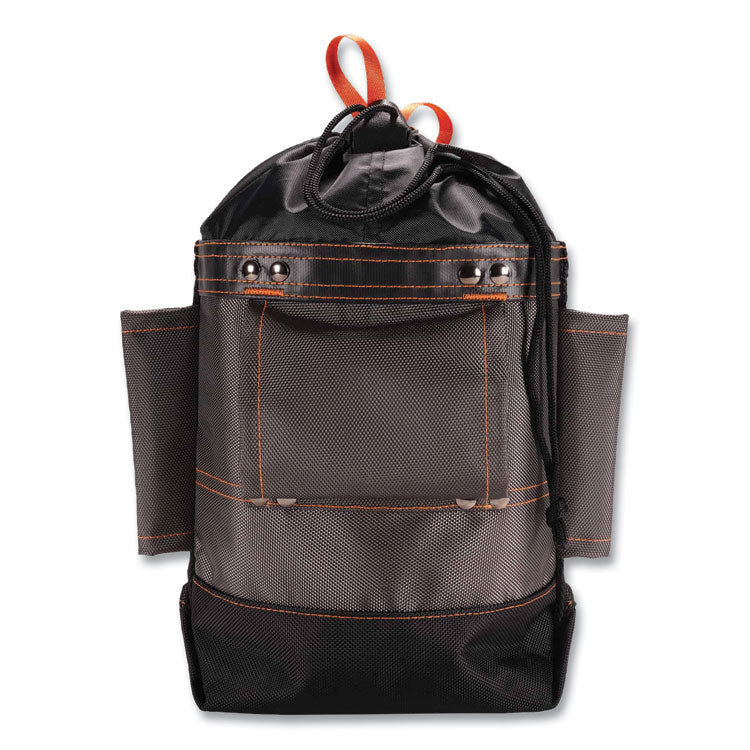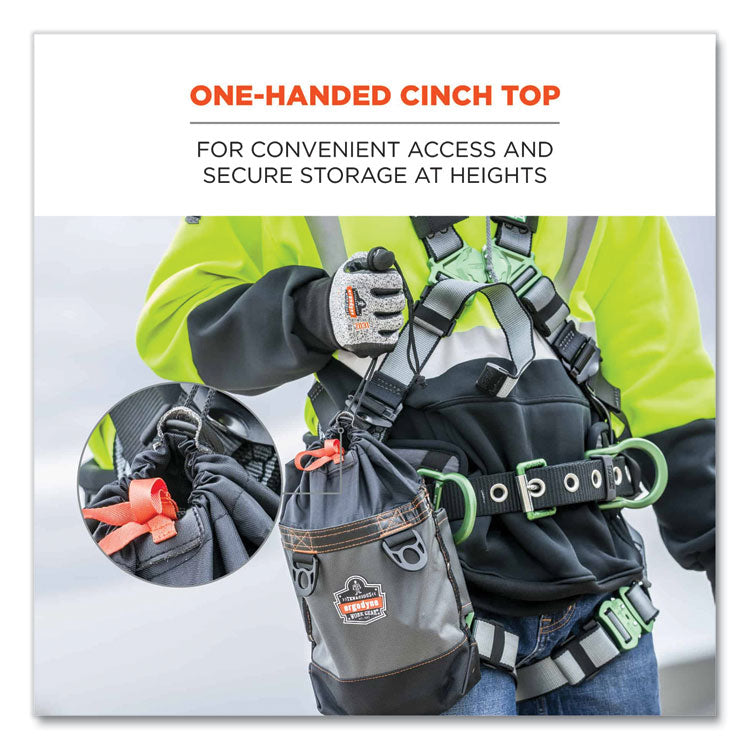 The Arsenal 5926 Topped Bolt Bag Tool Pouch is certified to the ANSI/ISEA 121-2018 dropped object prevention standard for safely storing and accessing hand tools, small parts and hardware while working at heights. Made with a 1680D ballistic polyester exterior, a 600D polyester ripstop lining and a 420D nylon drawstring top, this belt pouch is built for long-lasting durability. Designed for optimal tool storage and prevention of dropped objects, the one-handed cinch top enables convenient but secure access while at heights. A hi-vis orange ripstop lining makes it easy to find tools and small hardware. The exterior of this tool belt pouch features two tool loops for spud wrenches, bull pins or screwdrivers, as well as two D-rings for attaching tool lanyards. It also includes a nickel-plated storm drain for ventilation. HTO Type: Tool Bag; Material(s): Ballistic Polyester; Color(s): Black/Gray; Shape: Rectangular.