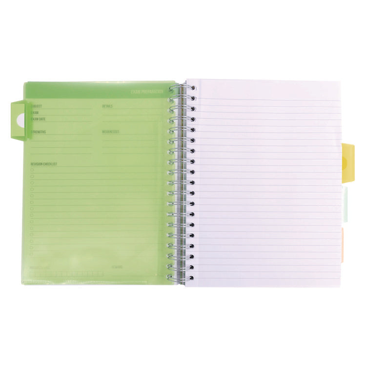 Wirebound excellence! Sturdy, subject-divided notebooks feature premium quality, bright white paper stock, allowing you to use a variety of pen types without worrying about ink bleed-through. Use both sides of each sheet without worry. Twin-wire spine makes it easy to fold the hard cover back flat, enabling notetaking on the go, even when no writing surface is available. Repositionable dividers can be configured and reconfigured again and again, an ideal feature for busy students taking notes across several subjects or courses. Slightly smaller than the American 8.5 x 11, letter-size standard, European B5 books might fit a bit more easily into briefcases and backpacks. Pocket-Sized Indicator: No; Book-Binding Type: Wire-O; Book-Binding Details: Wire-O: Flexible Cover; Book-Binding Edge: Side.