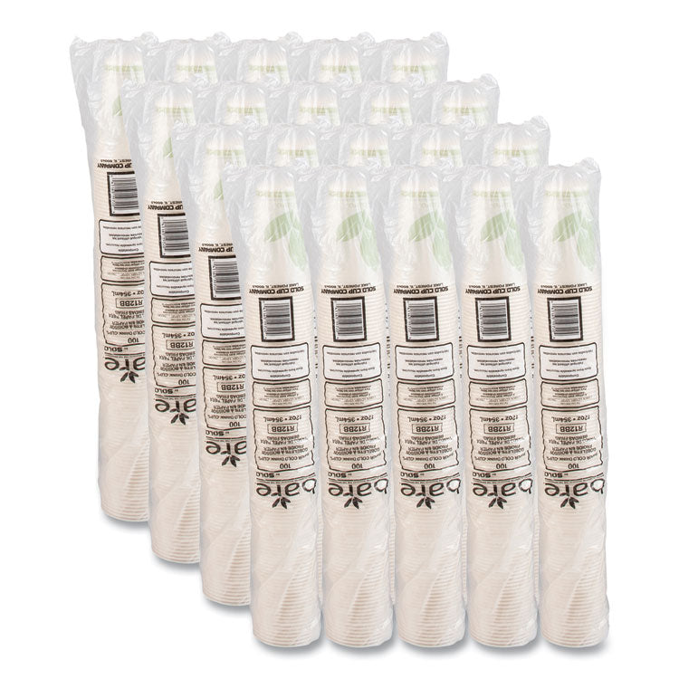 Made with plant-based renewable resources, Eco-Forward waxed paper cold cups provide a commercially compostable alternative. Wax coating creates firm, durable cup walls suitable for cold beverages. Cups provide a secure lid seal to prevent messy leaks while being used. ProPlanet SealThis product earns Dart's ProPlanet Seal because it meets ASTM requirements for commercial compostability. Cup Type: Cold Cup; Interior Volume Capacity: 12 oz; Material(s): Wax-Coated Paper; Material Type: Paper.