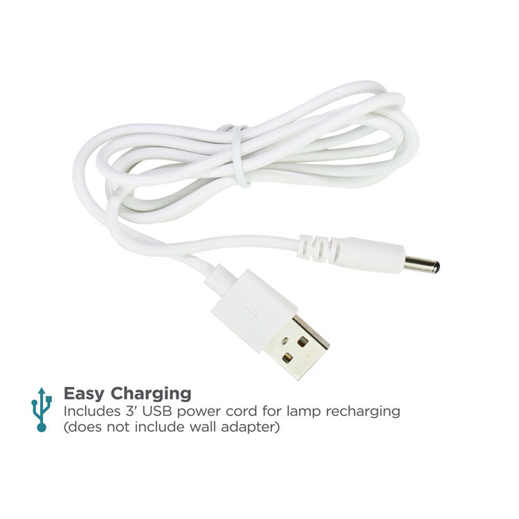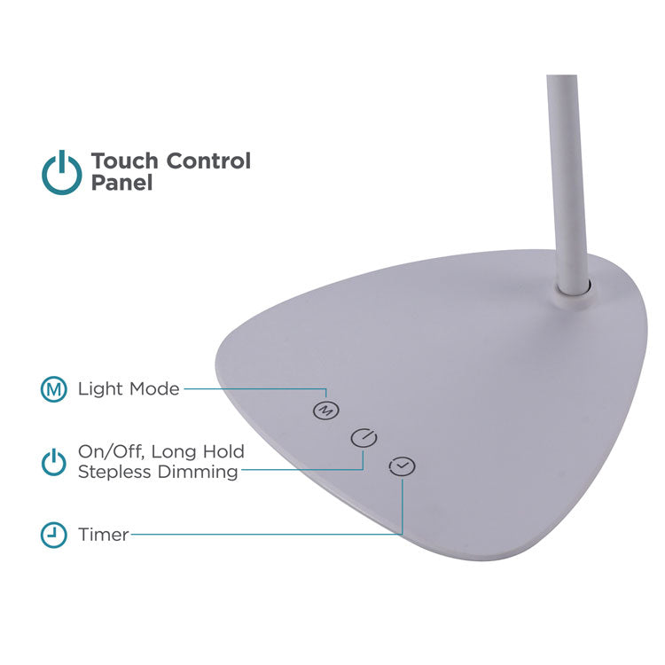 Taking on a simple and sleek look, this white desk lamp is great for on-the-go. It has a built-in rechargeable battery that lasts up to four hours, so you can keep it on your desk or keep it in the car for emergencies. It even is dimming so you can choose how much light you want to be released. Simply hold down to power button to select the dimness level. This full-spectrum minimalist desk lamp also includes a timer which you can operate if you choose. It automatically shuts off the lamp after 40 minutes. The silicone neck is great for finding the perfect light position. Did we mention this light mimics natural daylight? That's right, crystal clear illumination so you can focus on any task at hand. Base Color: White; Plug Type: 2 Prong; Height: 12.6"; Width: 6.81".