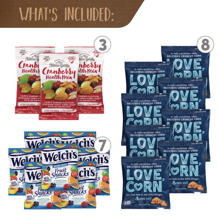 Better For You Snack Box allows you to enjoy all your favorite snacks without sacrificing the flavor. Great for sharing with coworkers or just hiding in your desk for delicious snack bars anytime of the day, the Better For You Snack Box is a great idea for the office or home! Products may vary by flavor per brand and substitutions may be made due to availability. Food Type: Snack Variety Packs; Flavor: Assorted; Capacity (Weight): 37 Assorted Snacks; Sugar Free: No.