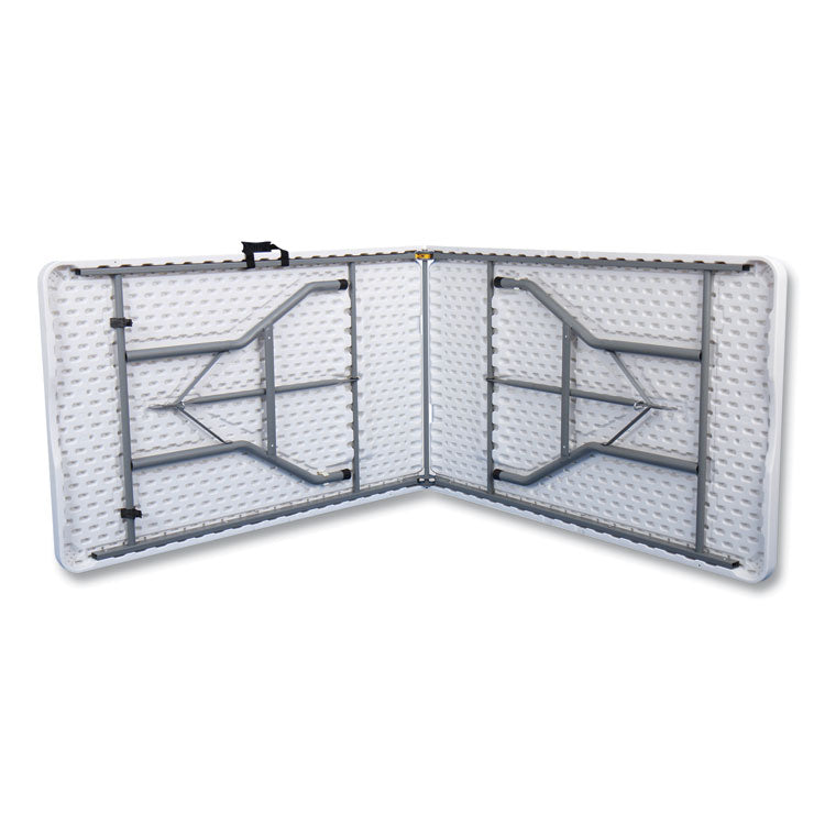 Sturdy in design, contemporary in appearance and surprisingly lightweight, Iceberg Resin-Top Bifold Tables feature a built-in carry handle and a convenient bifold format, where the tabletop folds in half while the legs fold up, to deliver an option that transports easily and stores compactly. Waterproof, scratch- and dent-resistant, the blow-molded, high-density polyethylene tabletop features rounded corners and soft-radius edges which both take away the sharp angles while allowing tablecloths to hang more neatly. Durable powder-coated steel legs with bracing bars ensure a solid, sturdy foundation. If you're looking for an indoor/outdoor table that's easy to set-up and take-down for offices, schools, trade shows, fairs, impromptu marketplaces or simply for outdoor parties, weddings and barbequesthese bifold tables might just be ideal. Top Color: White Granite; Color Family: White; Base Color: Gray; Top Shape: Rectangular.